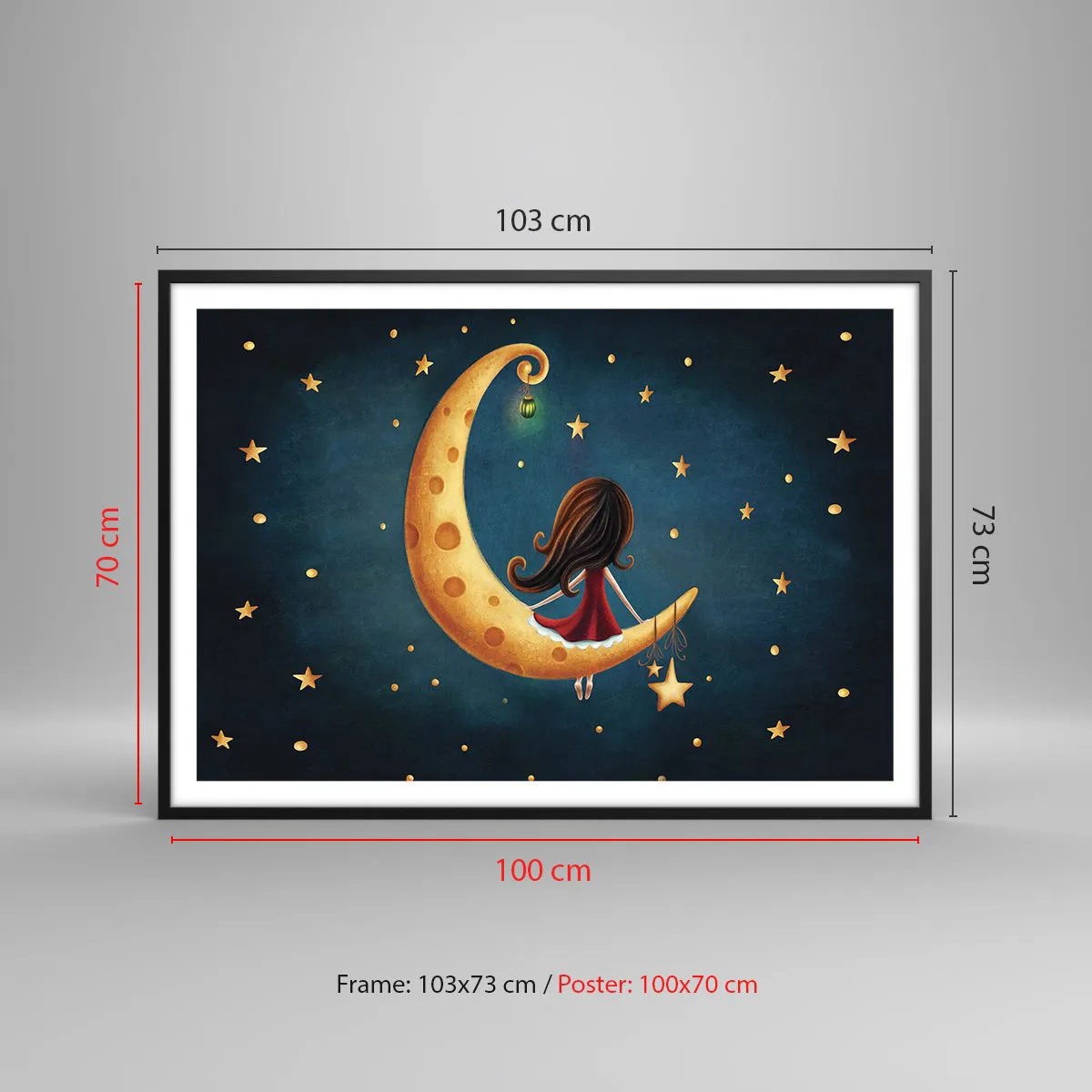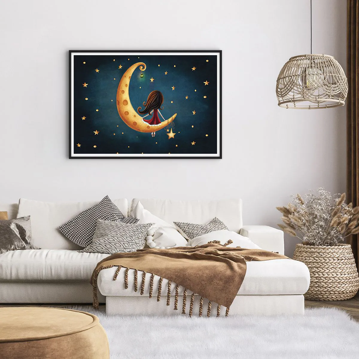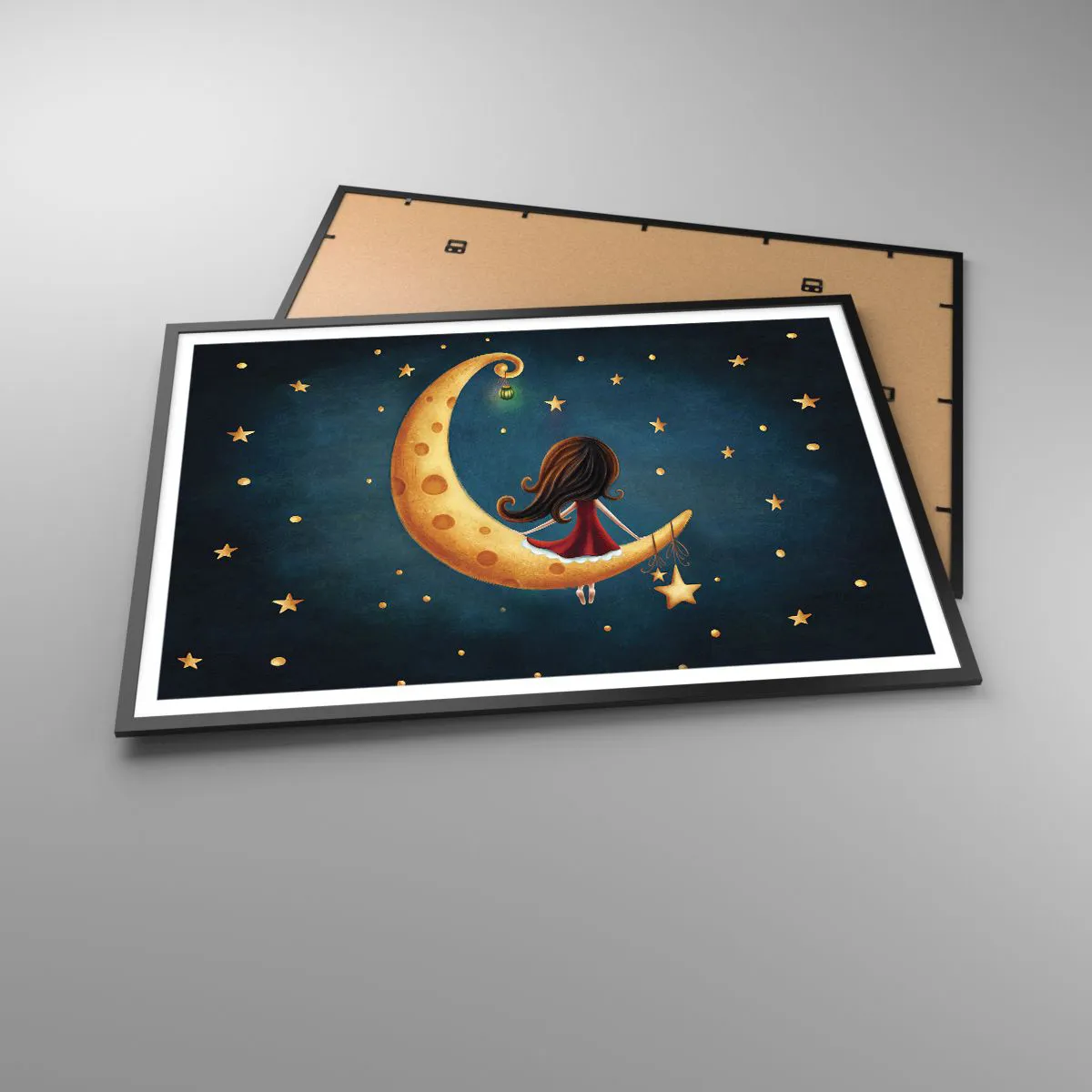 Poster in einem schwarzem Rahmen - Ein Mädchen auf dem Mond, umgeben von Sternen - 100x70cm - Einmal… - Moderne Wanddekoration für Wohnzimmer und Schlafzimmer ARTTOR