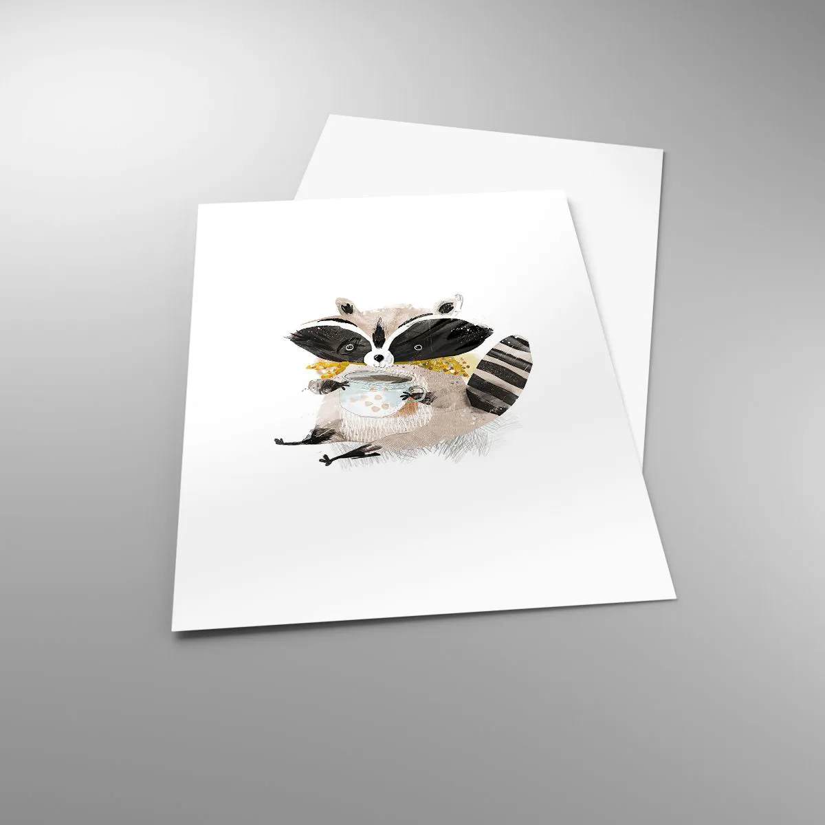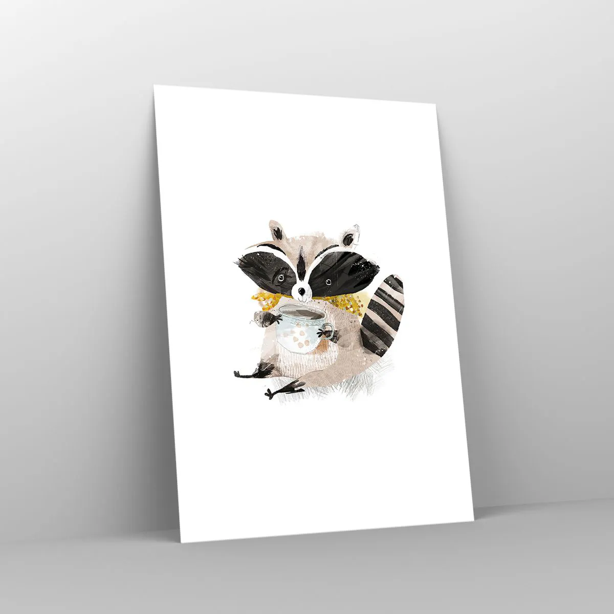 Poster - Eine Zeichnung eines Waschbären, der einen Schal trägt und eine Tasse Tee hält. - 50x70cm - Mein Freund der Waschbär - Moderne Wanddekoration für Wohnzimmer und Schlafzimmer ARTTOR