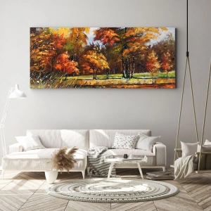 Bild auf Leinwand - Leinwandbild - Herbstlandschaft mit bunten Bäumen und einem Teich - 160x50cm - Landschaft in Gold und Bronze - Moderne Wanddekoration für Wohnzimmer und Schlafzimmer ARTTOR