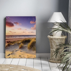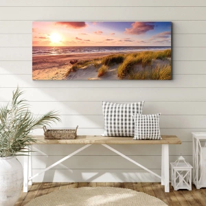 Bild auf Leinwand - Leinwandbild - Ein grasbewachsener Strand und ein Sonnenuntergang über einem ruhigen Meer - 70x50cm - Die Luft riecht schon im Sommer - Moderne Wanddekoration für Wohnzimmer und Schlafzimmer ARTTOR