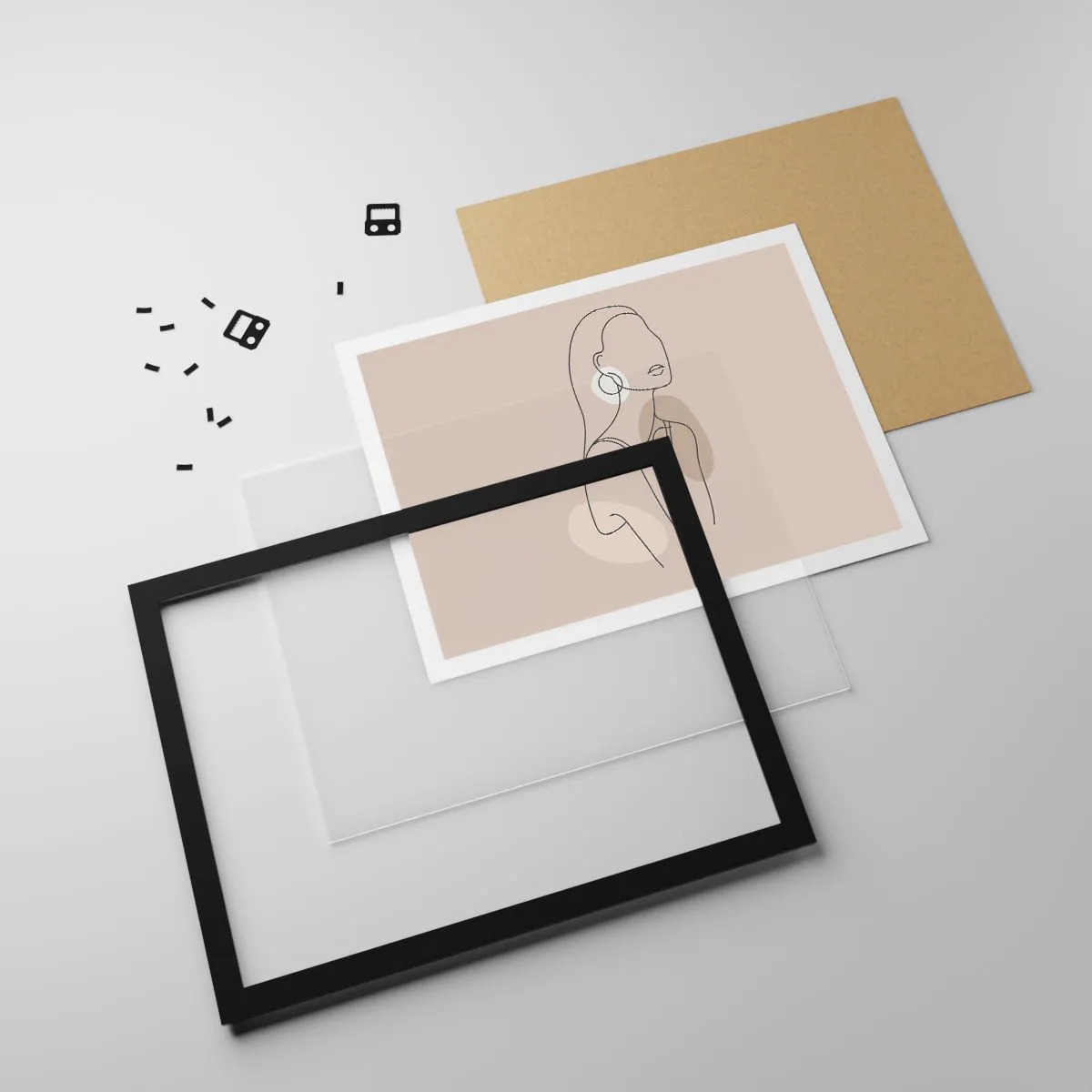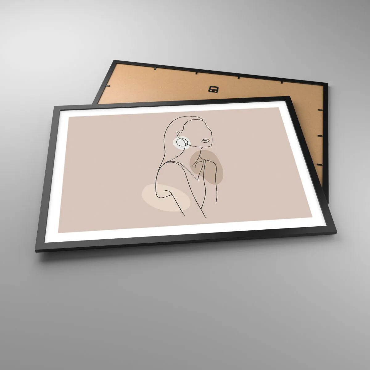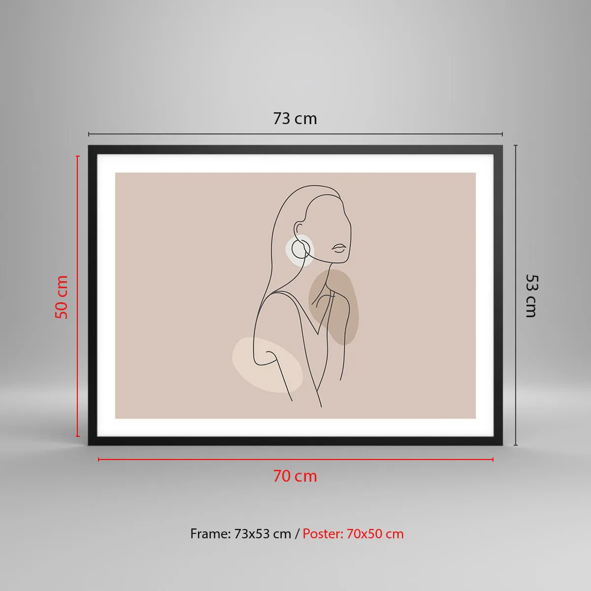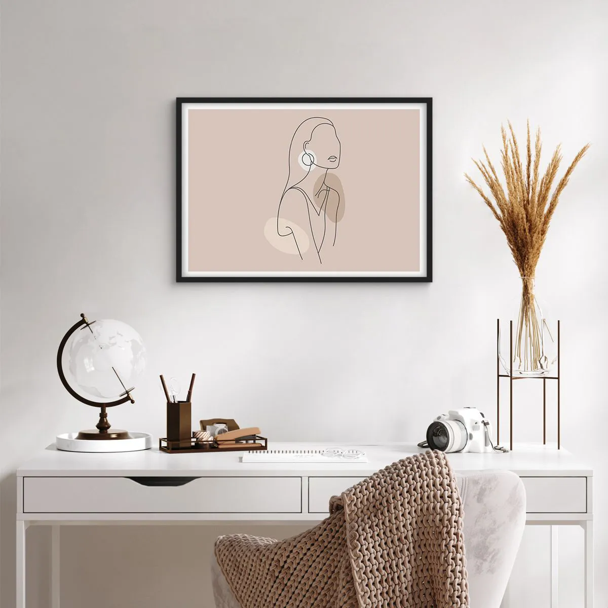 Poster in einem schwarzem Rahmen - Minimalistische Illustration einer Frau mit Umrissen auf beigem Hintergrund - 70x50cm - Mädchenhafte Ikone - Moderne Wanddekoration für Wohnzimmer und Schlafzimmer ARTTOR