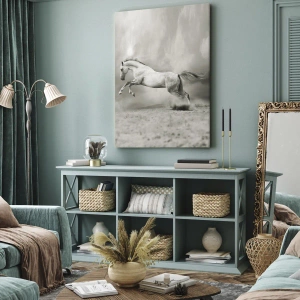 Bild auf Leinwand - Leinwandbild - Ein weißes Pferd in einem dynamischen Sprung vor dem Hintergrund nebliger Wolken. - 100x70cm - Zwischen Aufwachen und Schlafen - Moderne Wanddekoration für Wohnzimmer und Schlafzimmer ARTTOR