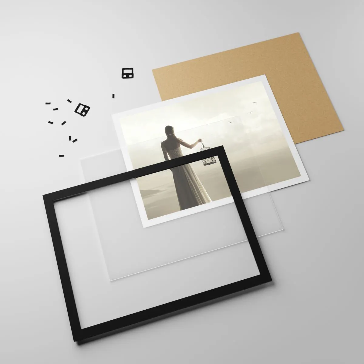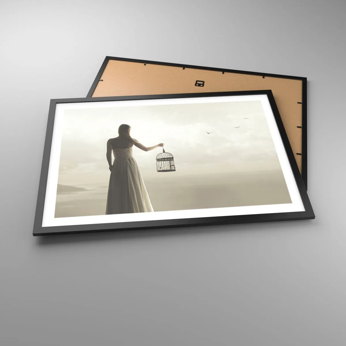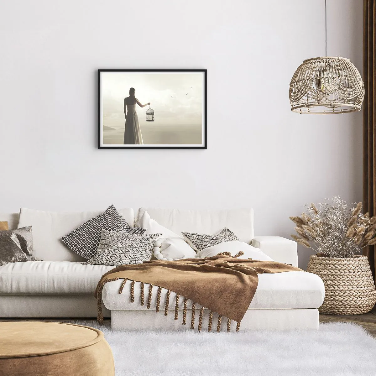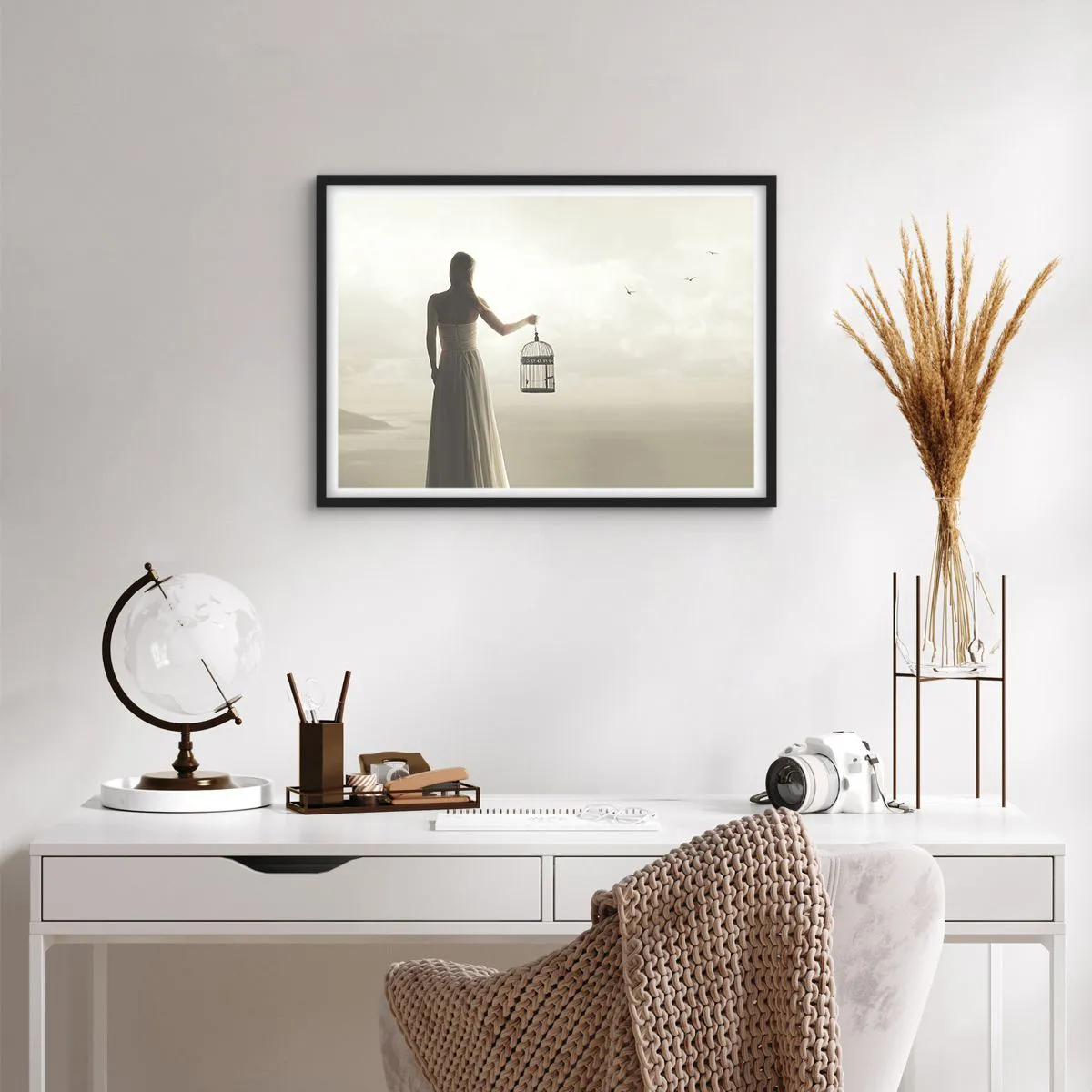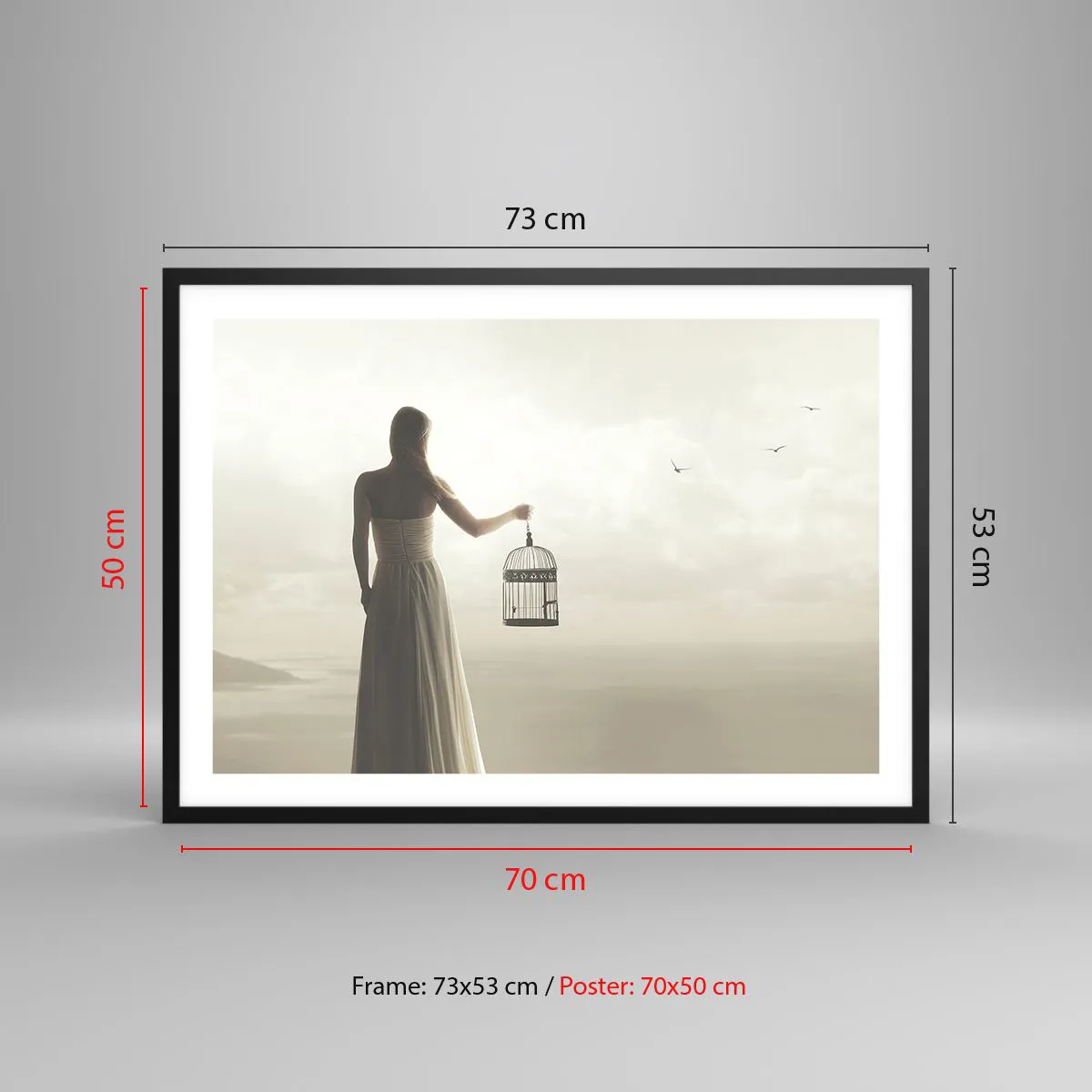 Poster in einem schwarzem Rahmen - Eine Frau mit einem Käfig vor einem ruhigen Himmel - 70x50cm - Sei frei - Moderne Wanddekoration für Wohnzimmer und Schlafzimmer ARTTOR