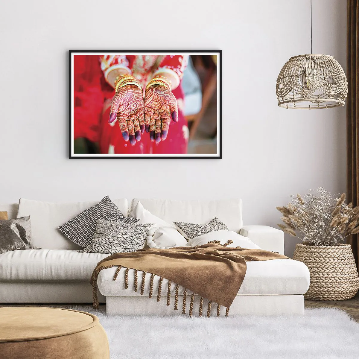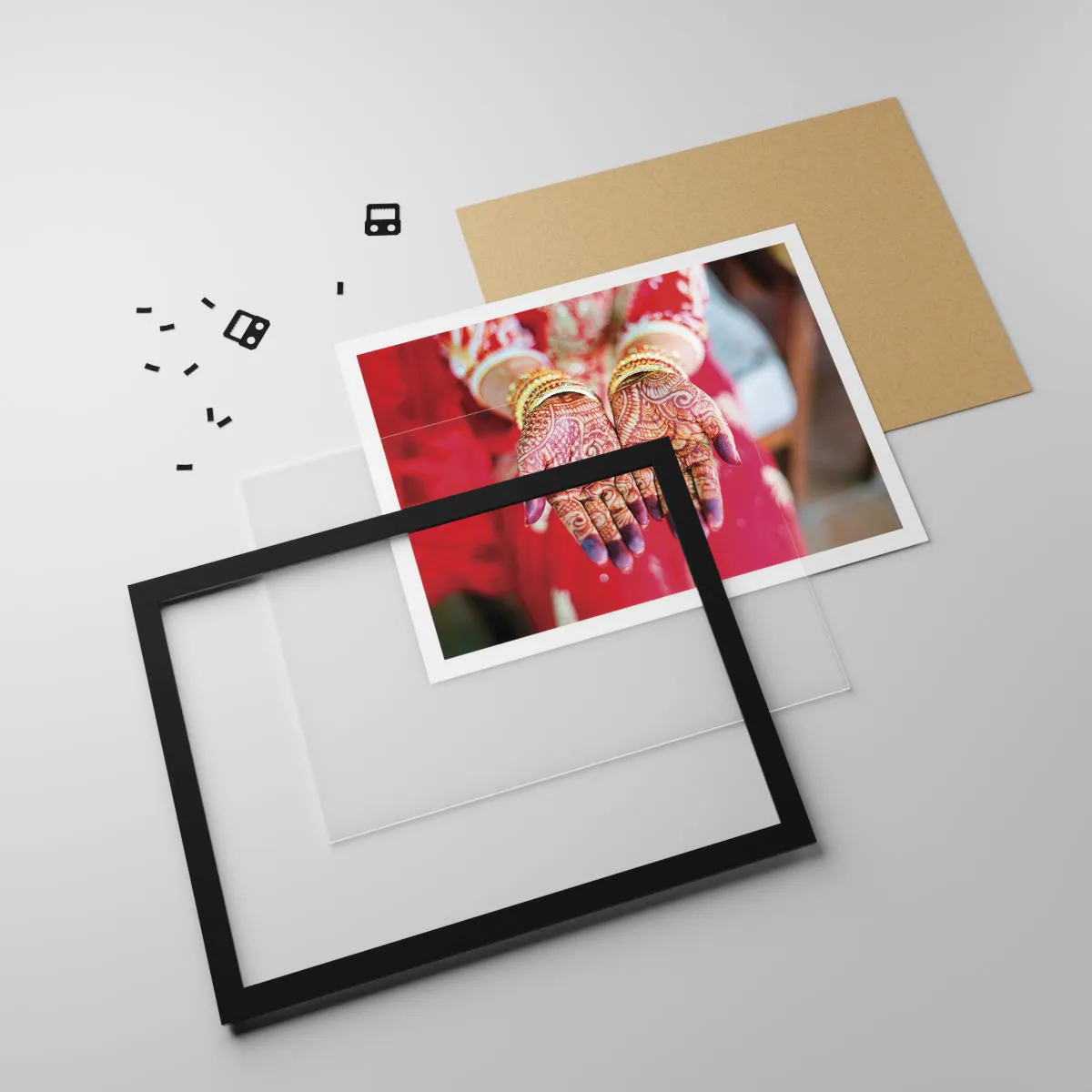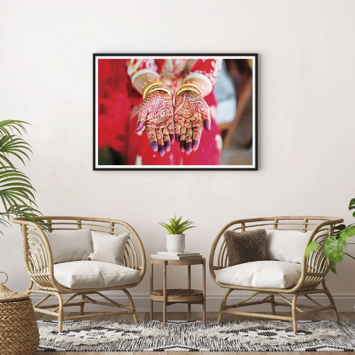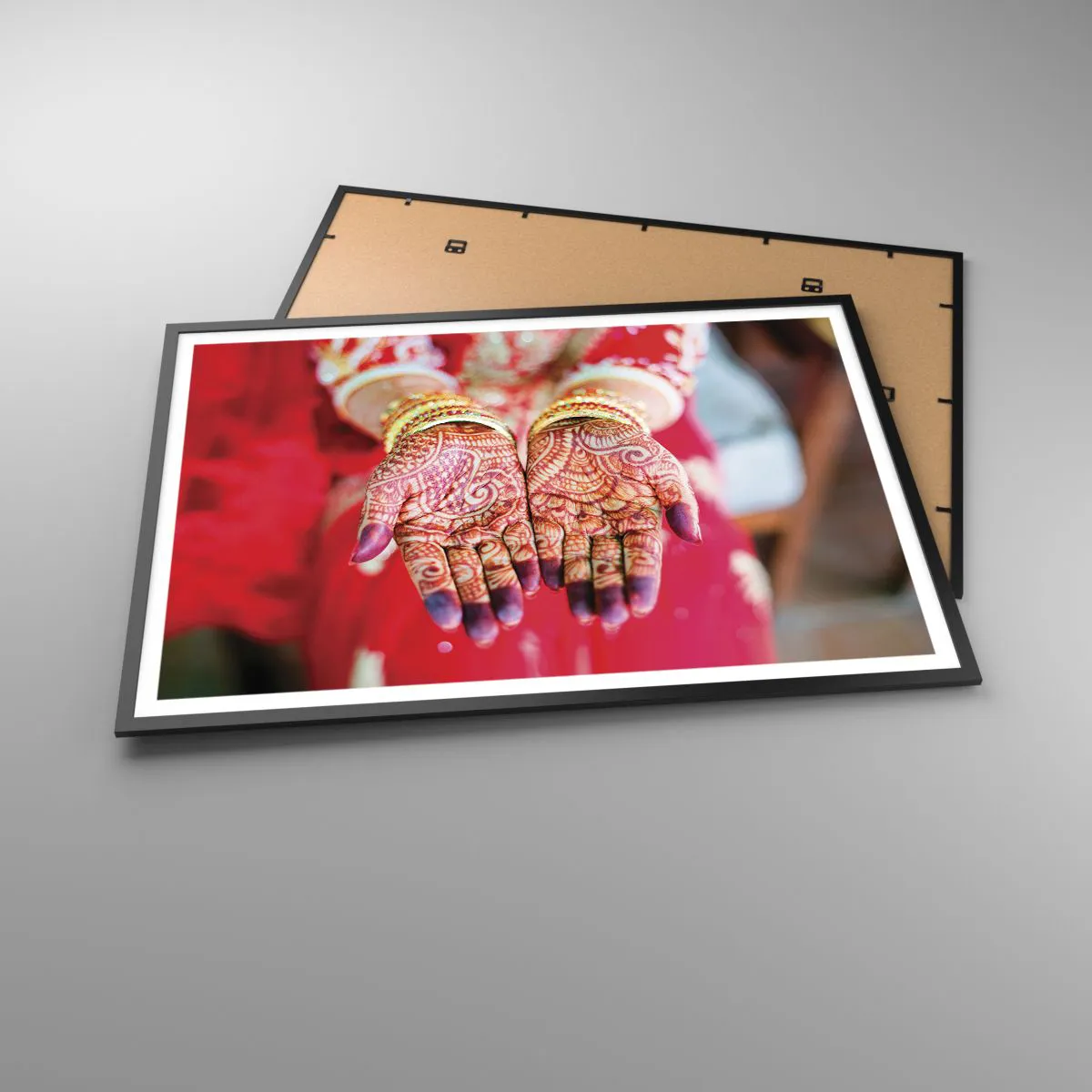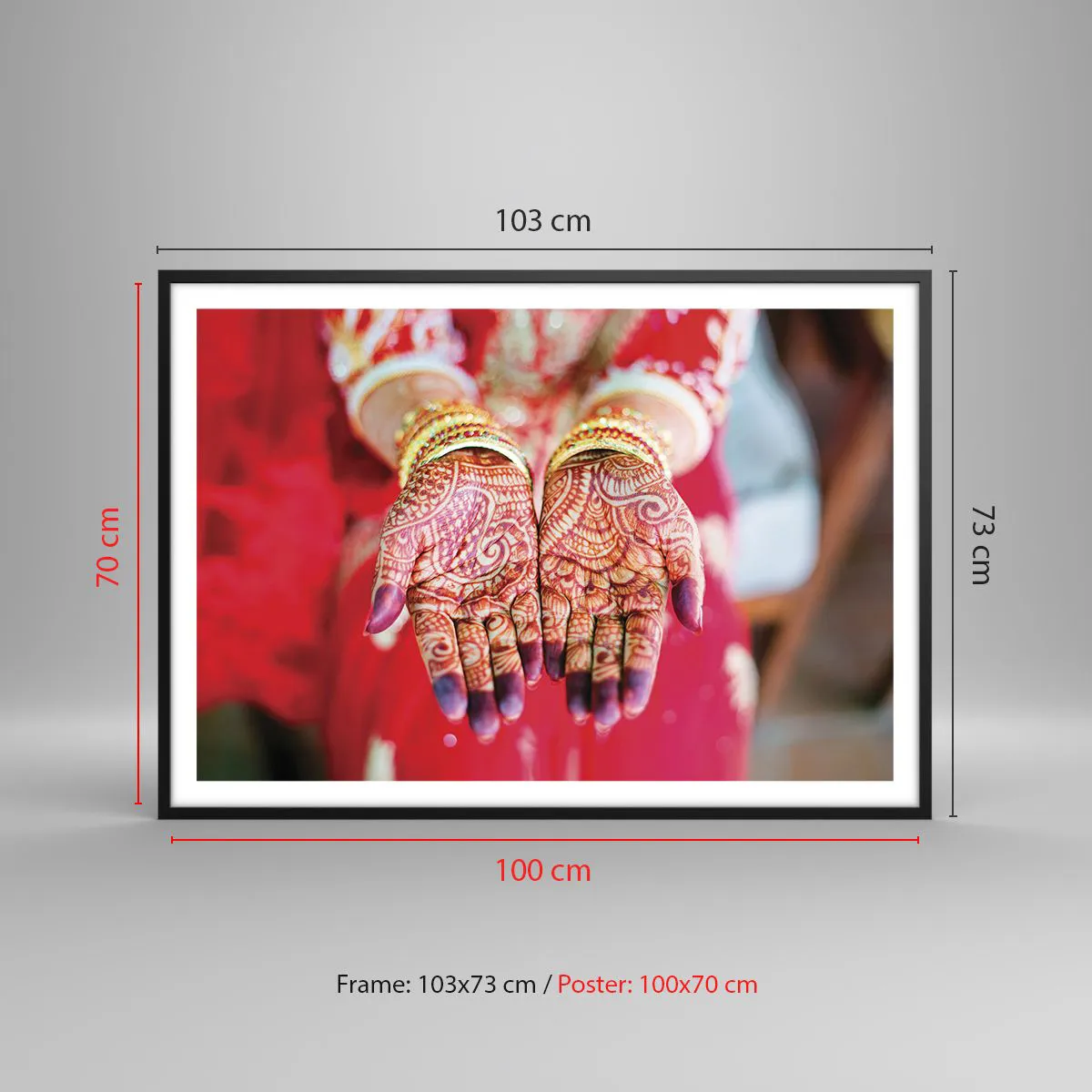Poster in einem schwarzem Rahmen - Mit Henna verzierte Hände vor dem Hintergrund eines roten Kleides - 100x70cm - Bereit, das Glück zu fangen? - Moderne Wanddekoration für Wohnzimmer und Schlafzimmer ARTTOR