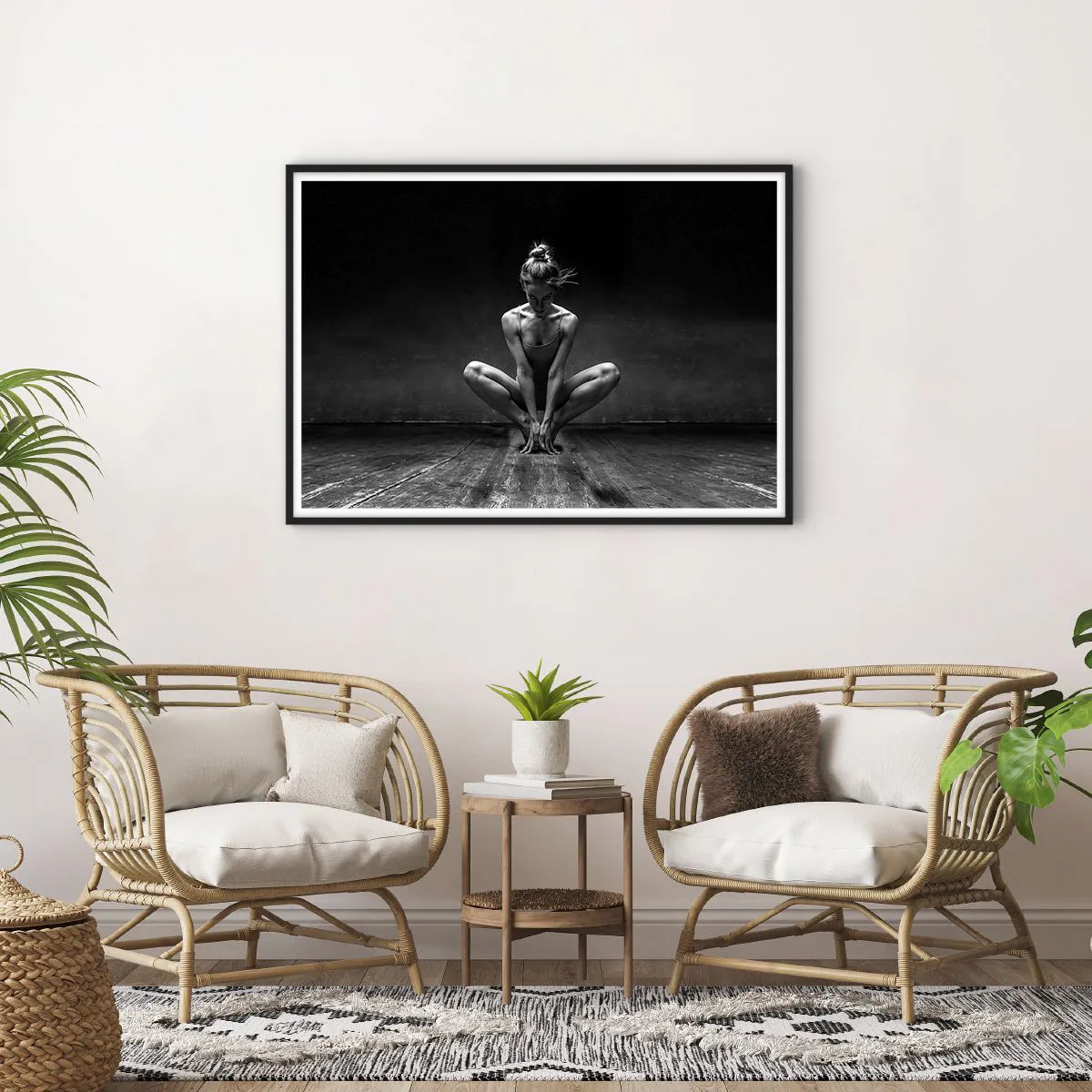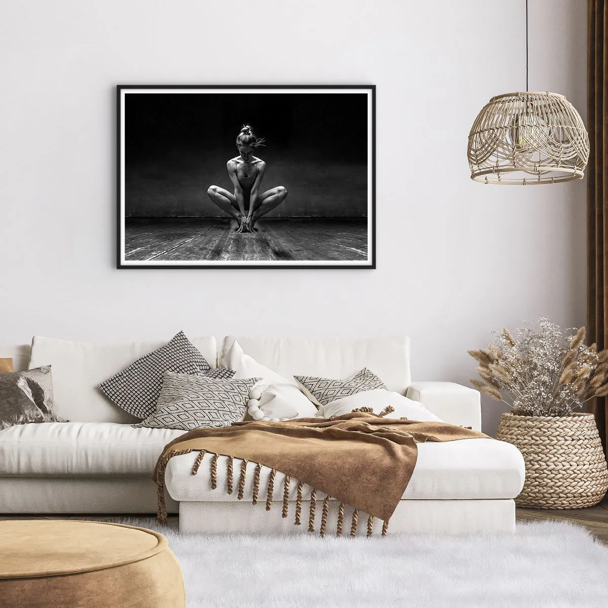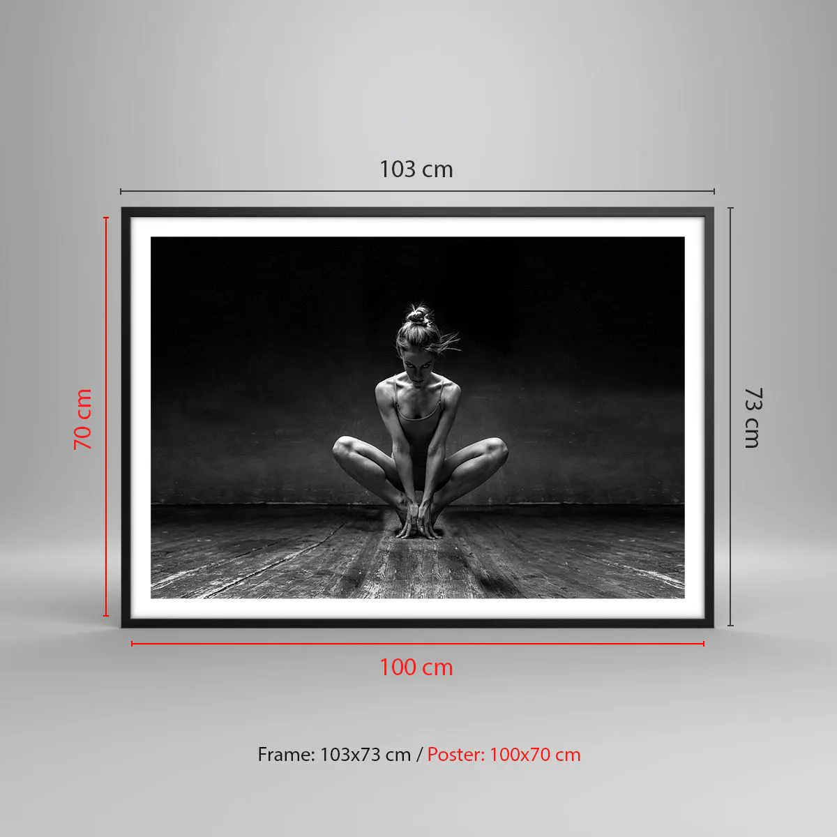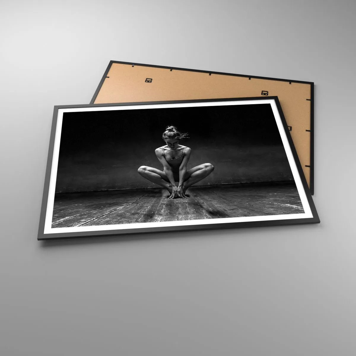 Poster in einem schwarzem Rahmen - Ein Schwarz-Weiß-Porträt einer Tänzerin in voller Konzentration. - 100x70cm - Konzentration der Tanzenergie - Moderne Wanddekoration für Wohnzimmer und Schlafzimmer ARTTOR