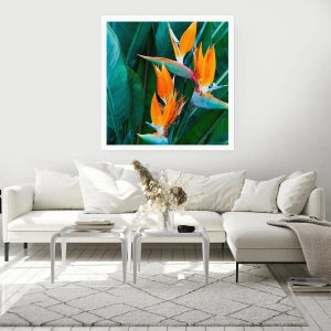 Poster - Strelitzia-Blüten, umgeben von grünen Blättern - 50x70cm - Ist es eine Blume oder ist es ein Vogel? - Moderne Wanddekoration für Wohnzimmer und Schlafzimmer ARTTOR