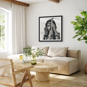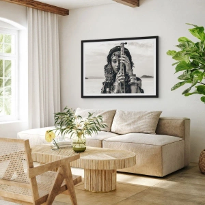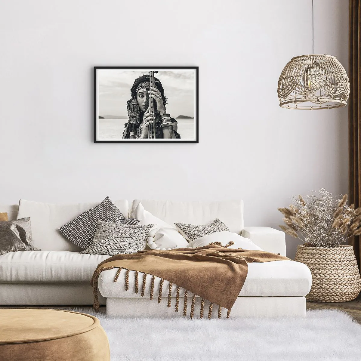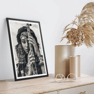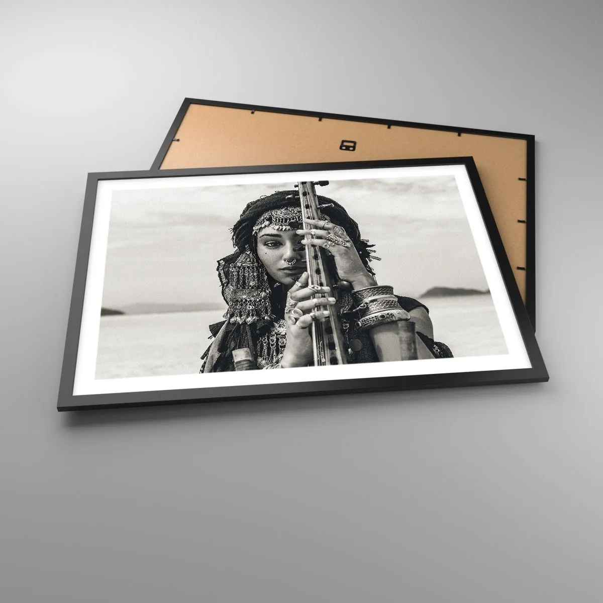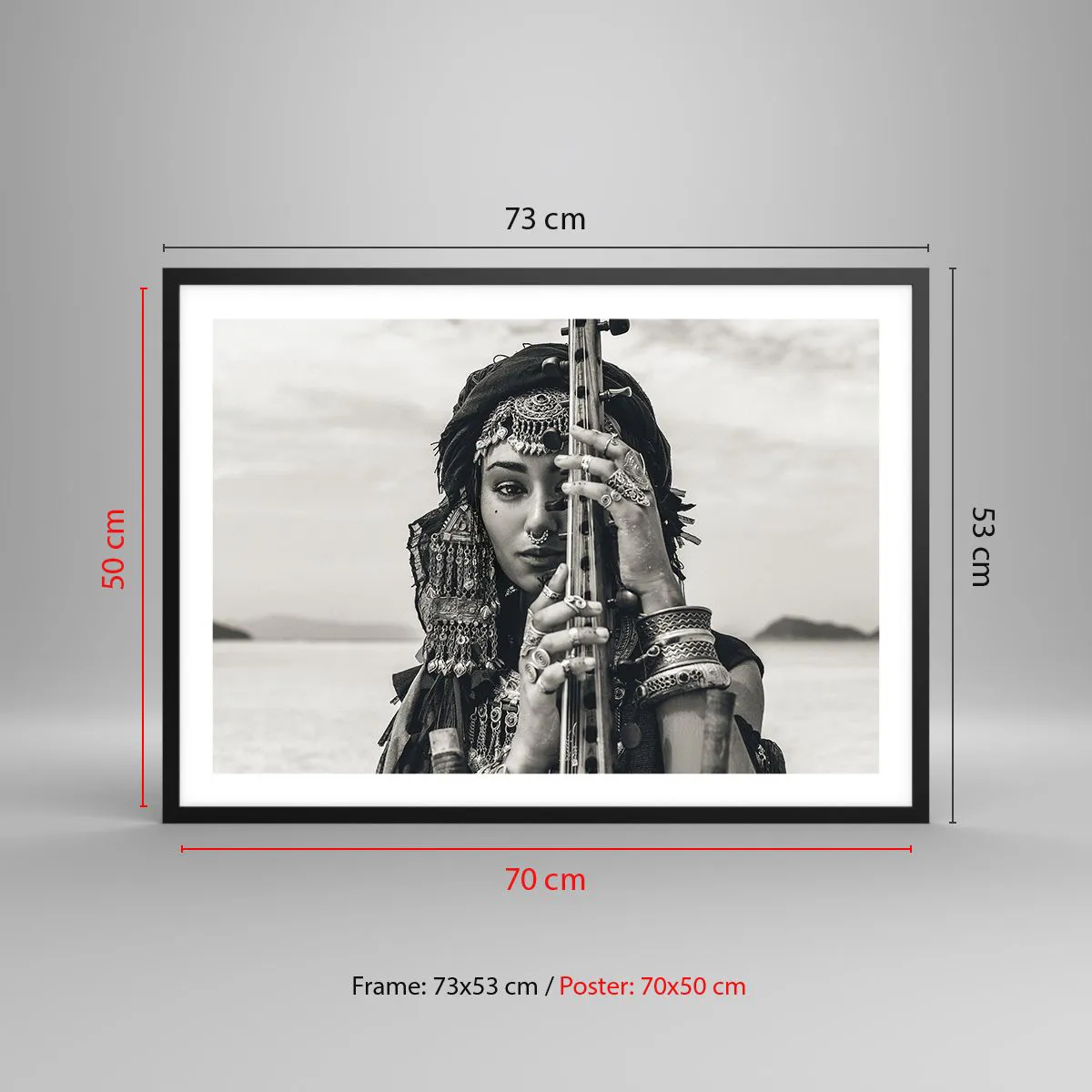 Poster in einem schwarzem Rahmen - Porträt einer Frau mit ethnischem Schmuck, die ein Instrument in der Hand hält - 70x50cm - Die Musik des Orients selbst - Moderne Wanddekoration für Wohnzimmer und Schlafzimmer ARTTOR