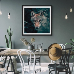 Poster in einem schwarzem Rahmen - Ein Wolf in seiner natürlichen Umgebung, der aus den Tiefen des Waldes hervorschaut. - 70x50cm - Jäger - Moderne Wanddekoration für Wohnzimmer und Schlafzimmer ARTTOR