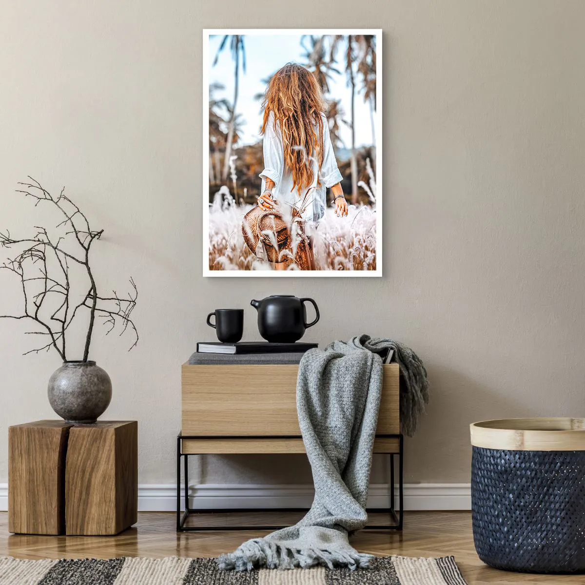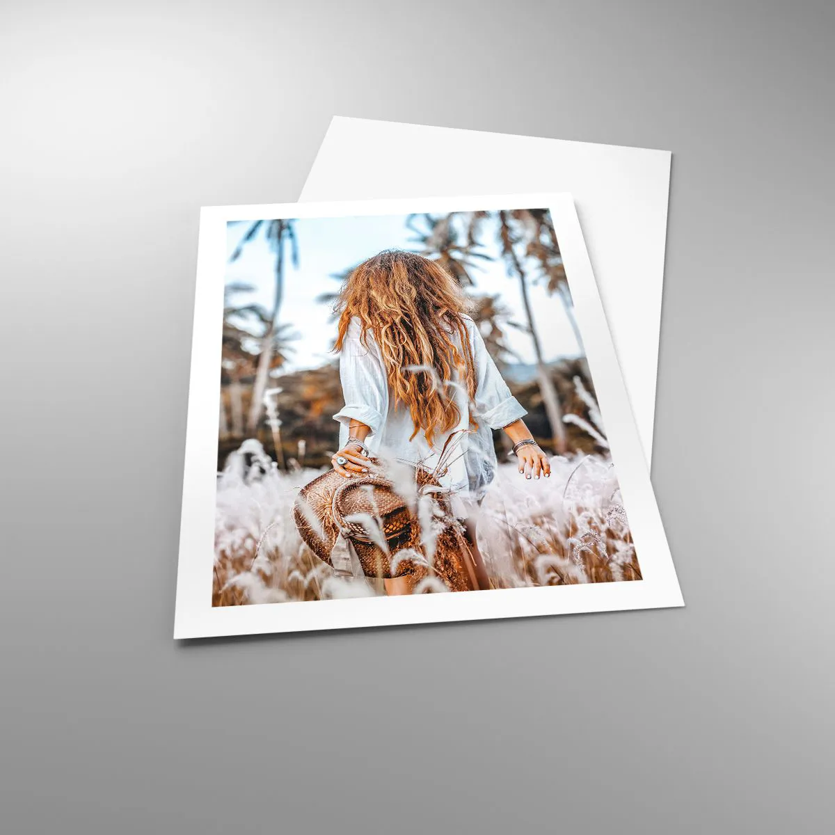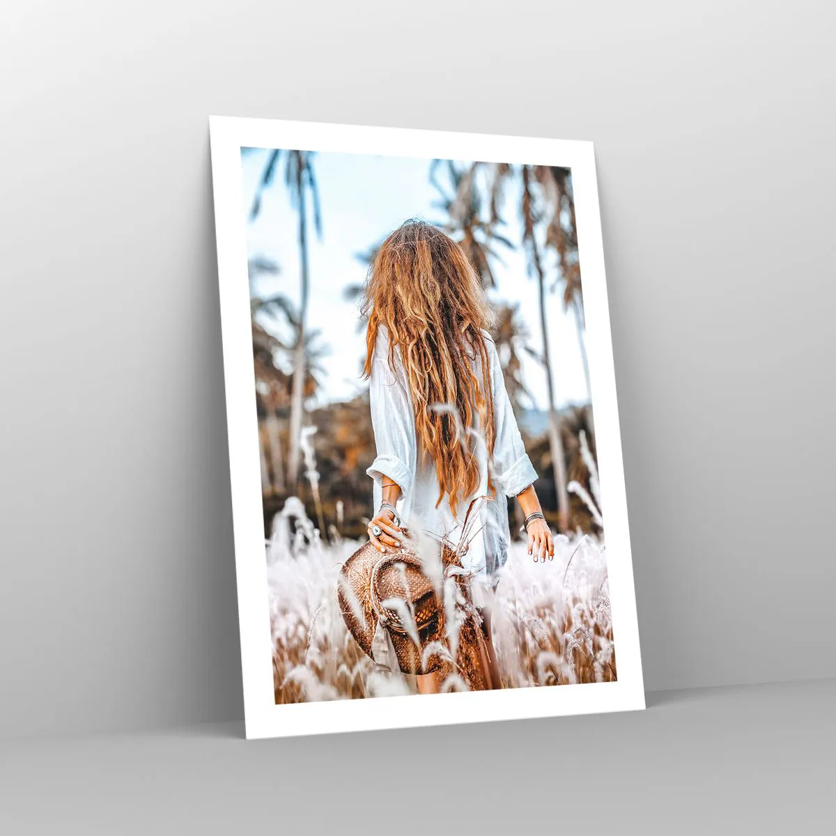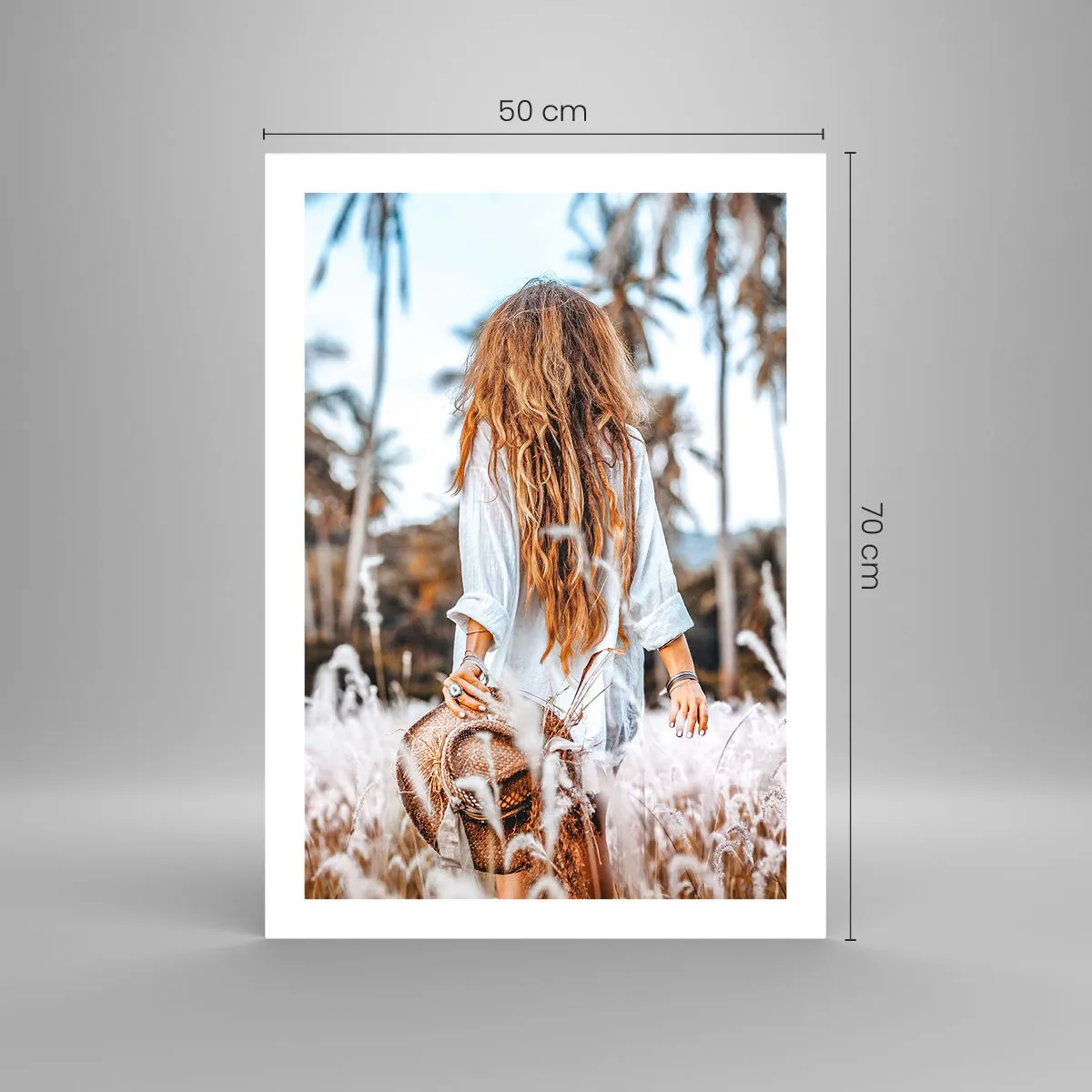Poster - Eine Frau in einem weißen Hemd geht zwischen Palmen spazieren - 50x70cm - Geboren aus Grasflaum - Moderne Wanddekoration für Wohnzimmer und Schlafzimmer ARTTOR