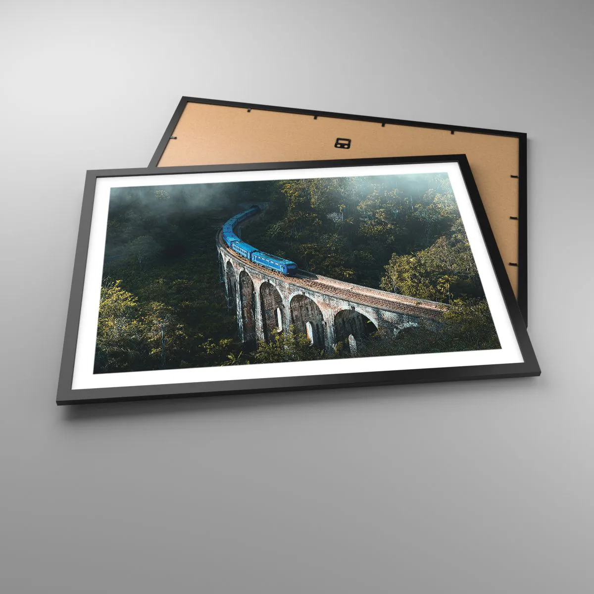 Poster in einem schwarzem Rahmen - Ein blauer Zug auf einem historischen Viadukt inmitten der Wälder - 70x50cm - Neigung zur Natur - Moderne Wanddekoration für Wohnzimmer und Schlafzimmer ARTTOR