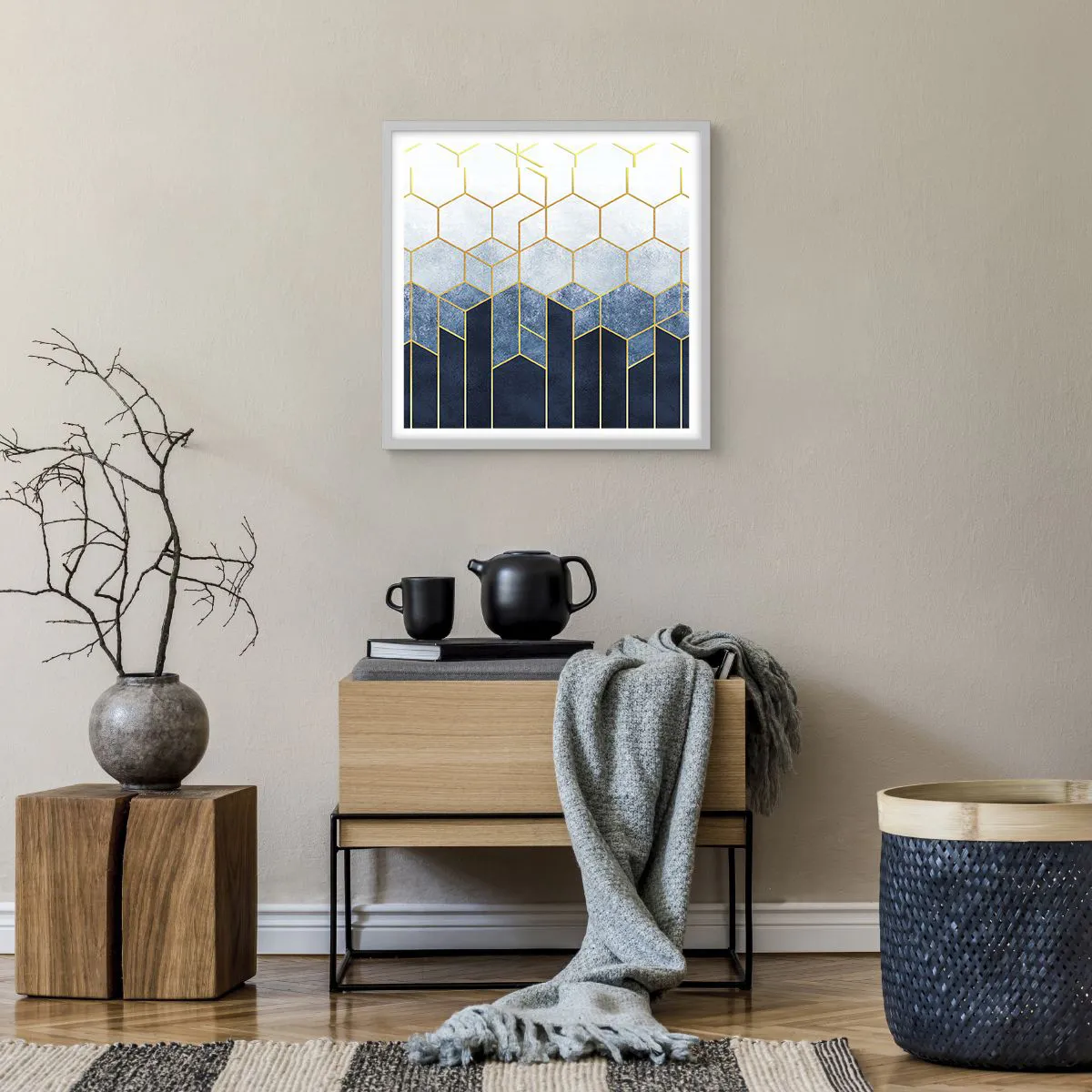 • Abstrakt, Kunst, Sechseck, Abstrakte Kunst, Für das Büro, für das Arbeitszimmer, für das Esszimmer, für den Flur, für das Wohnzimmer, für das Schlafzimmer, Blau, Grau, Gold, Quadrat