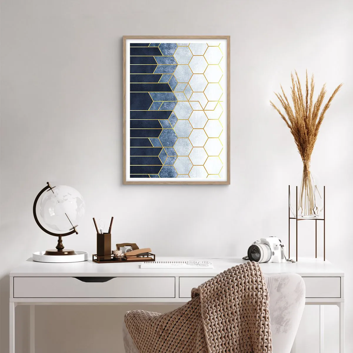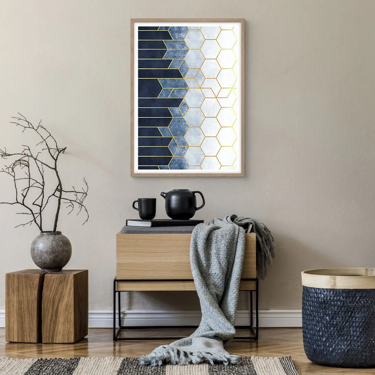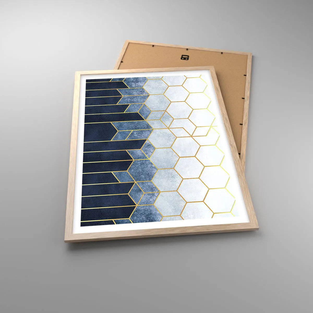 • Abstrakt, Kunst, Sechseck, Abstrakte Kunst, Für das Büro, für das Arbeitszimmer, für das Esszimmer, für den Flur, für das Wohnzimmer, für das Schlafzimmer, Blau, Grau, Gold, Vertikal