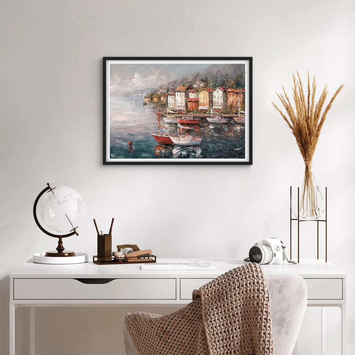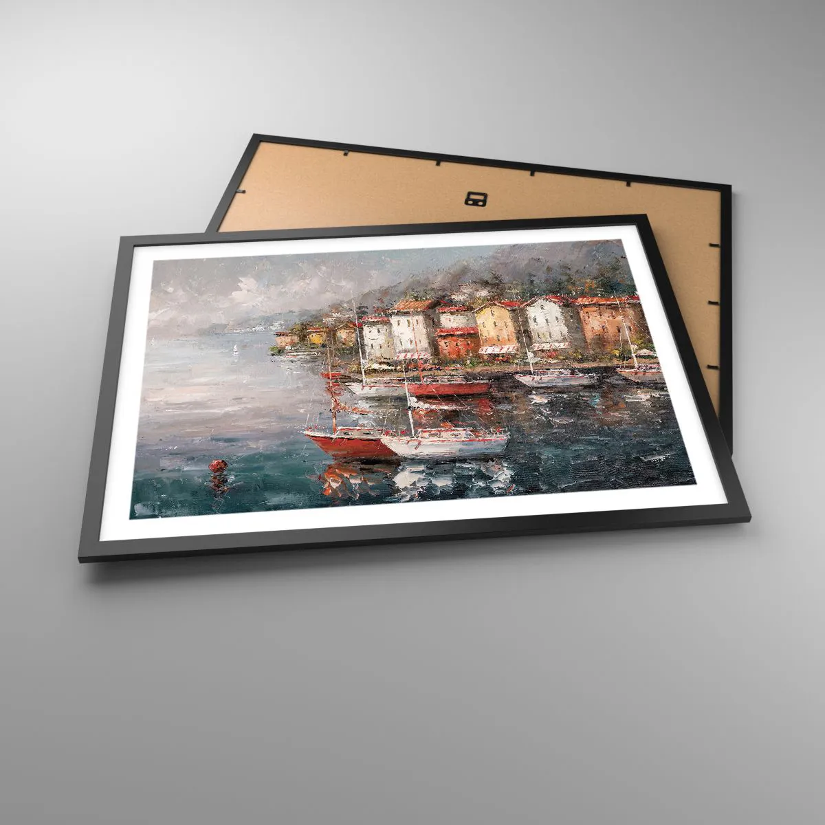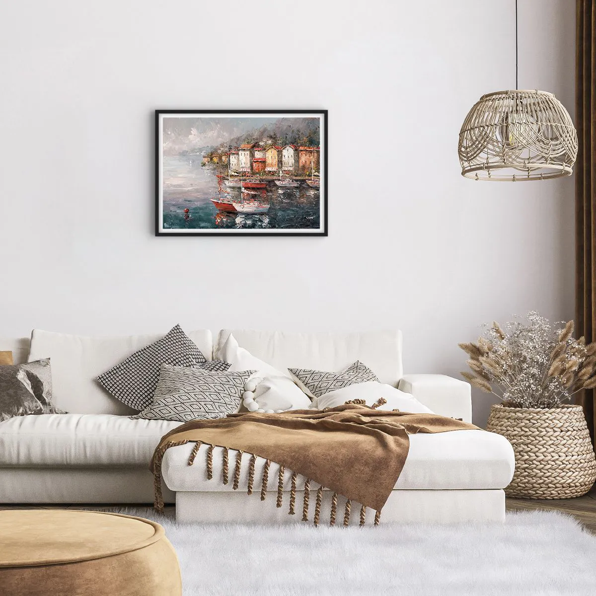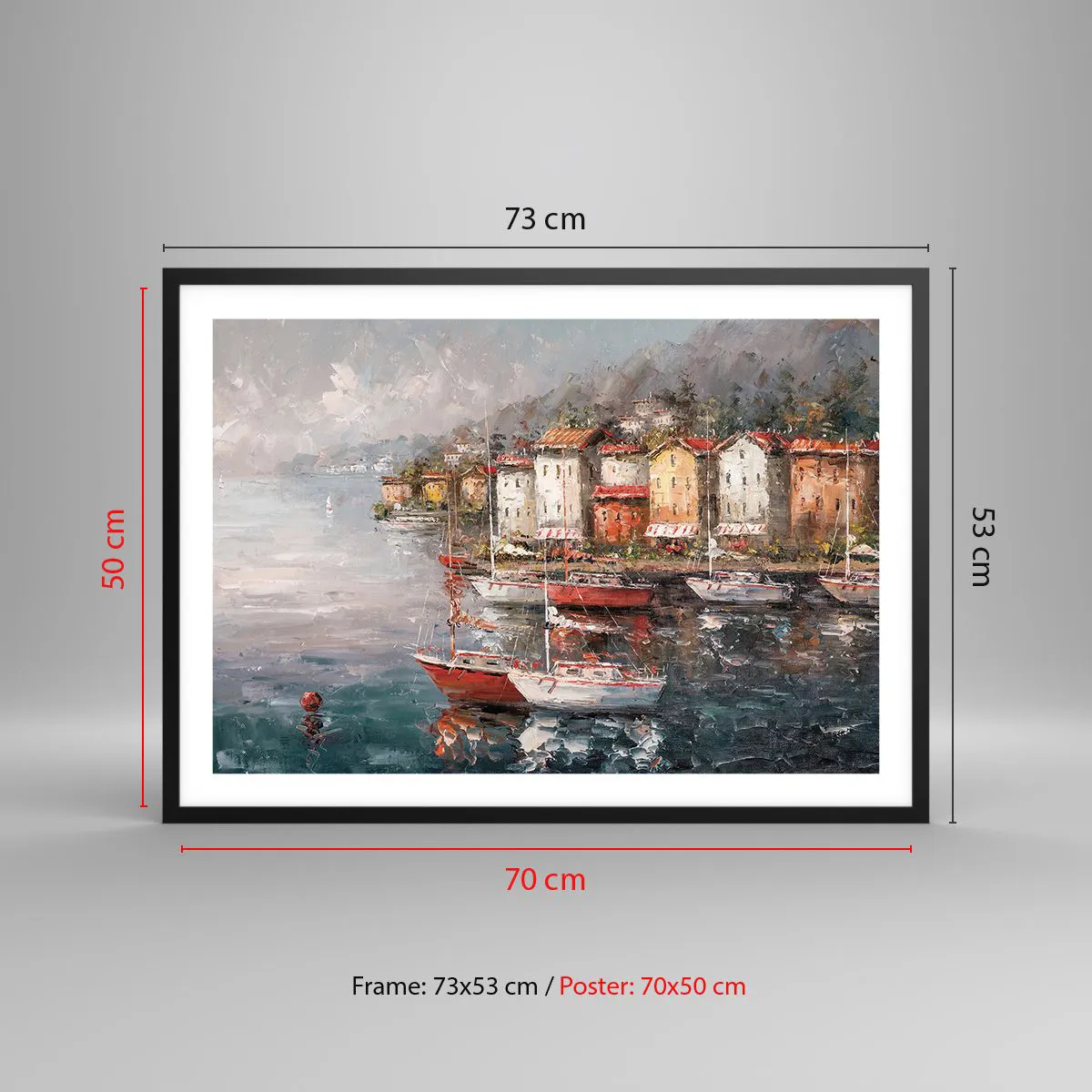 Poster in einem schwarzem Rahmen - Küstenlandschaft mit Booten und bunten Häusern - 70x50cm - Romantische Oase - Moderne Wanddekoration für Wohnzimmer und Schlafzimmer ARTTOR