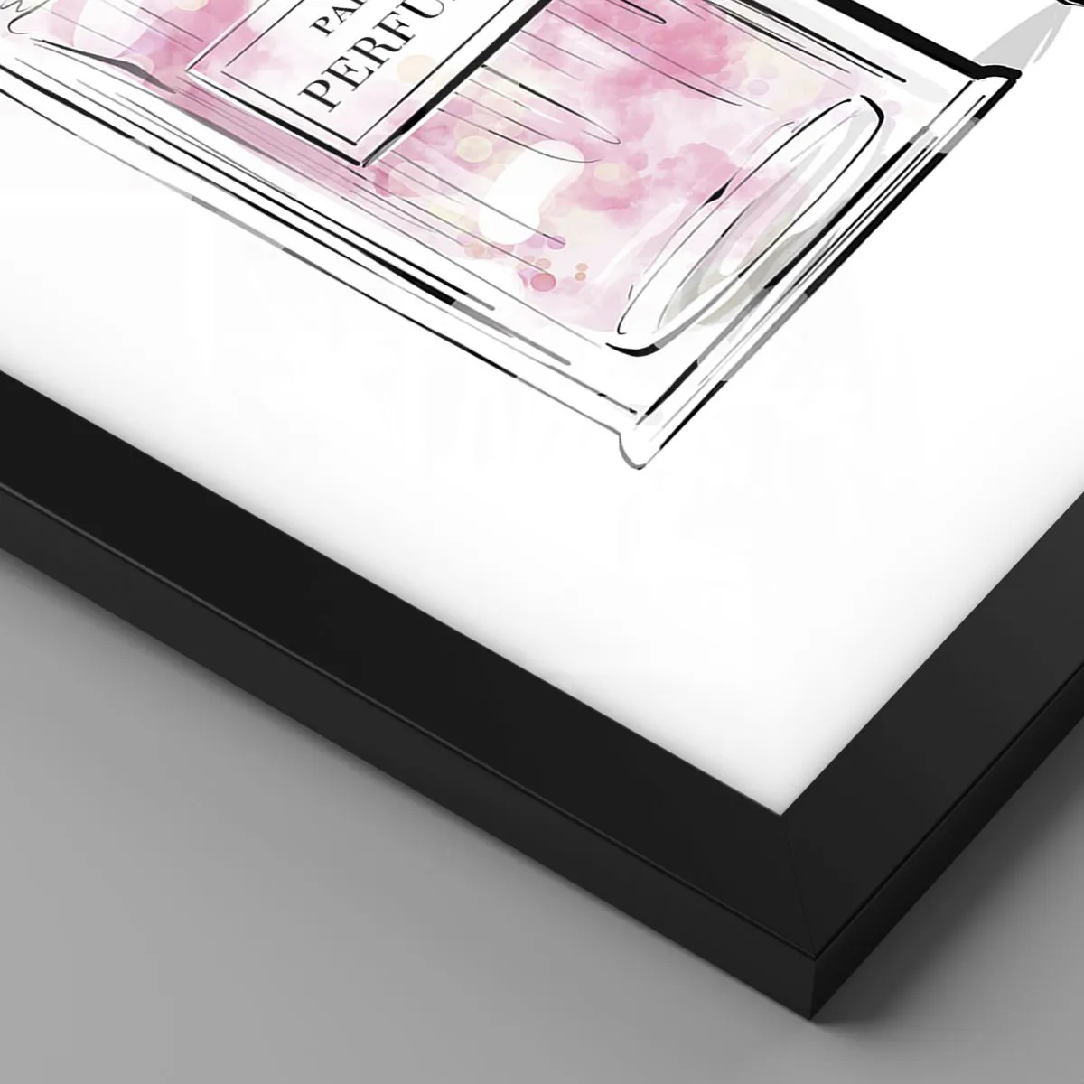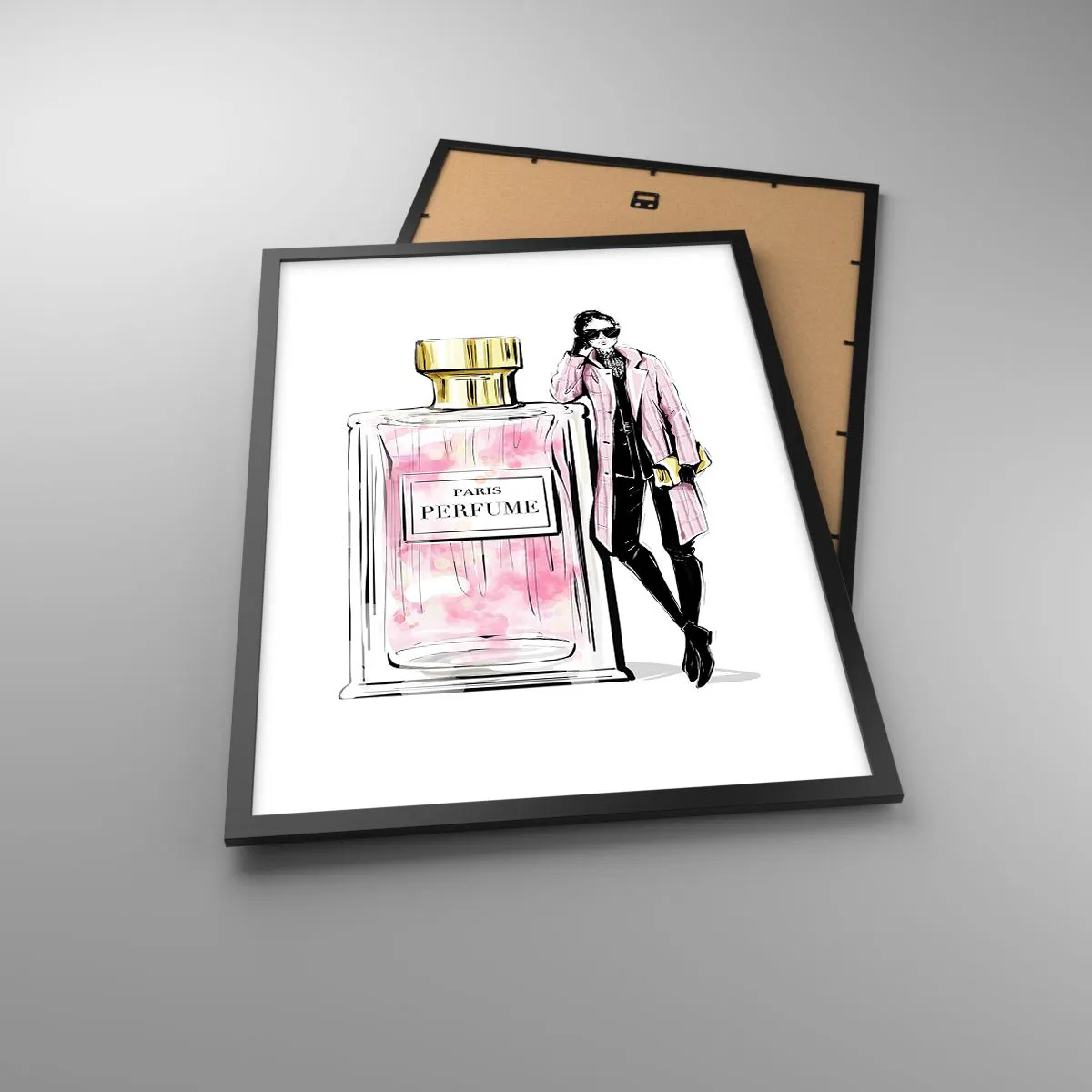 Poster in einem schwarzem Rahmen - Ein eleganter Parfümflakon mit der Silhouette einer stilvollen Frau - 50x70cm - Pariser Sinnlichkeit - Moderne Wanddekoration für Wohnzimmer und Schlafzimmer ARTTOR