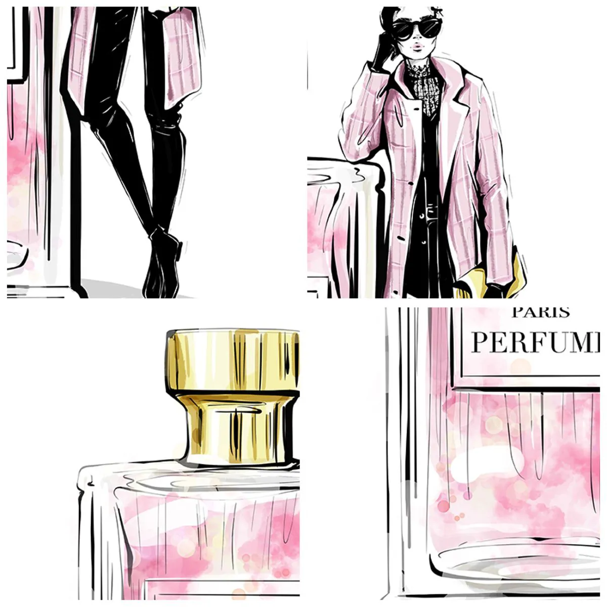 - Eine stilvolle Illustration, die einen eleganten Parfümflakon und eine weibliche Silhouette in einem modischen Outfit darstellt. Ein modernes Poster für Liebhaber von Mode und Luxusdesign.
