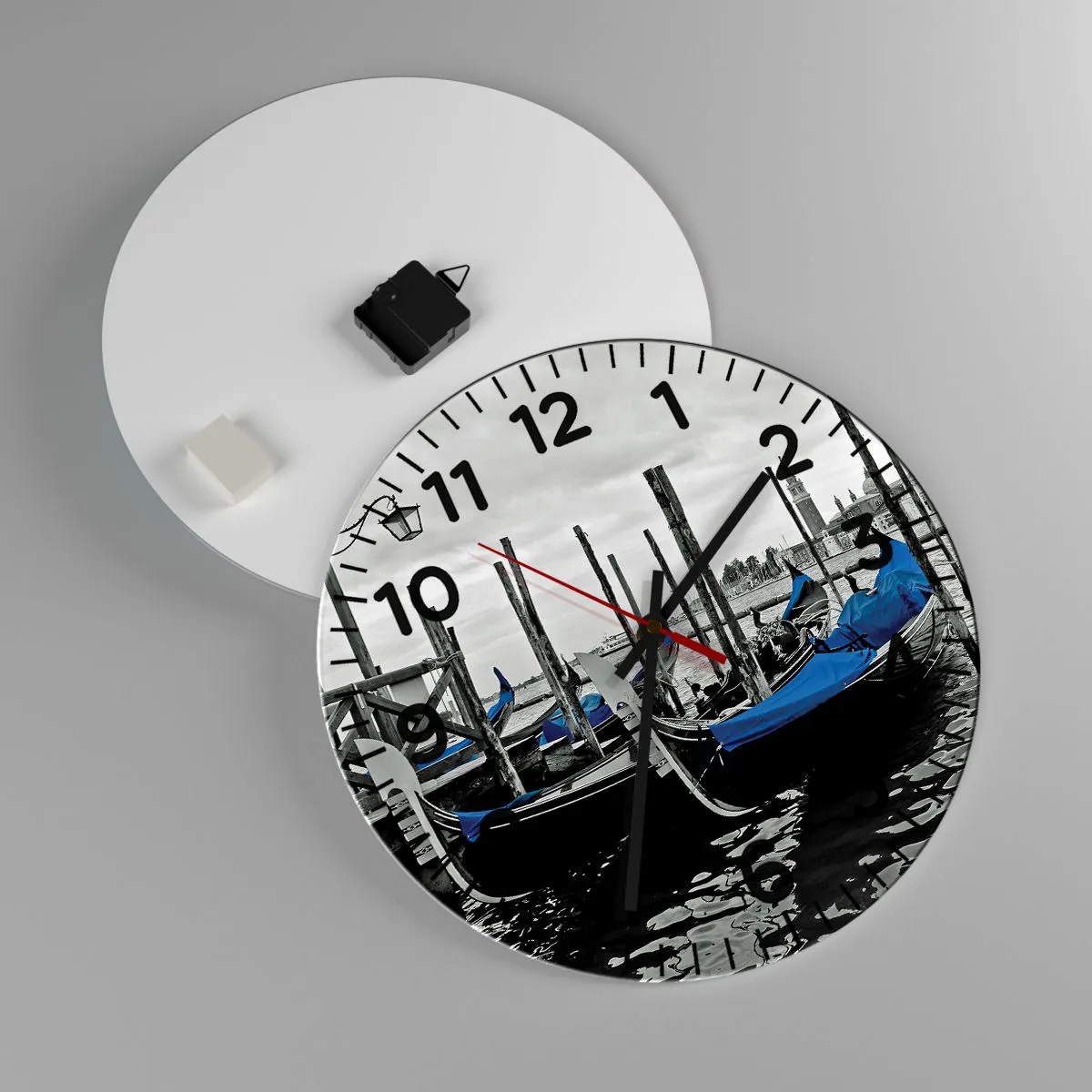 Die Uhr besteht aus 4 mm dickem Sicherheitsglas Glas. Die Herstellungstechnologie der Uhr entspricht der Sicherheitsklasse 2B2 gemäß der Norm PN-EN 12600: 2004, die Stoßfestigkeit garantiert. Die Uhr auf dem Glas ist bereit zu hängen - es hat einen Metallanhänger, einen Anhänger auf der Rückseite der Uhr und einen Schaumstoffabstand, der einen gleichmäßigen Abstand zwischen der Uhr und der Wand reguliert. Die Uhr hat einen geräuschlosen Schwimmmechanismus, der von einer 1,5-V-Batterie betrieben wird - AA-Batterie inbegriffen).