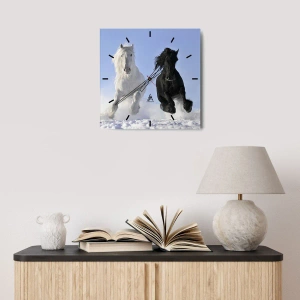 Wanduhr - Glasuhr - Ein weißes und ein schwarzes Pferd galoppieren durch den Schnee - 30x30cm - Schwarz-Weiß-Galopp - Moderne Wanddekoration für Wohnzimmer und Schlafzimmer ARTTOR
