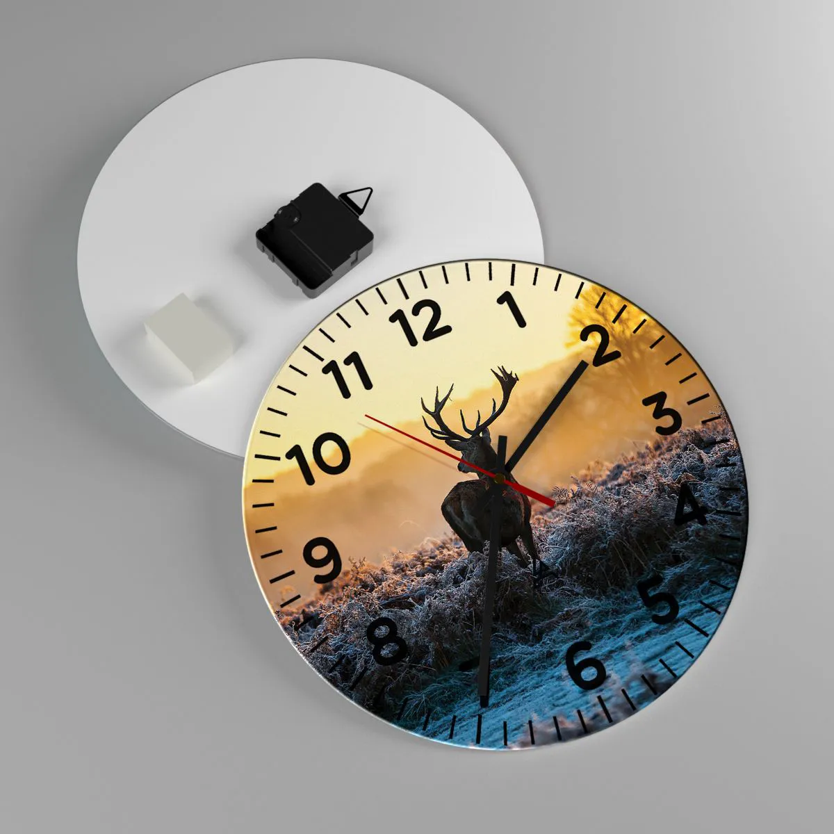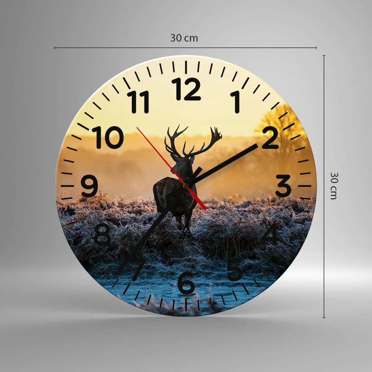 Die Uhr besteht aus 4 mm dickem Sicherheitsglas Glas. Die Herstellungstechnologie der Uhr entspricht der Sicherheitsklasse 2B2 gemäß der Norm PN-EN 12600: 2004, die Stoßfestigkeit garantiert. Die Uhr auf dem Glas ist bereit zu hängen - es hat einen Metallanhänger, einen Anhänger auf der Rückseite der Uhr und einen Schaumstoffabstand, der einen gleichmäßigen Abstand zwischen der Uhr und der Wand reguliert. Die Uhr hat einen geräuschlosen Schwimmmechanismus, der von einer 1,5-V-Batterie betrieben wird - AA-Batterie inbegriffen).