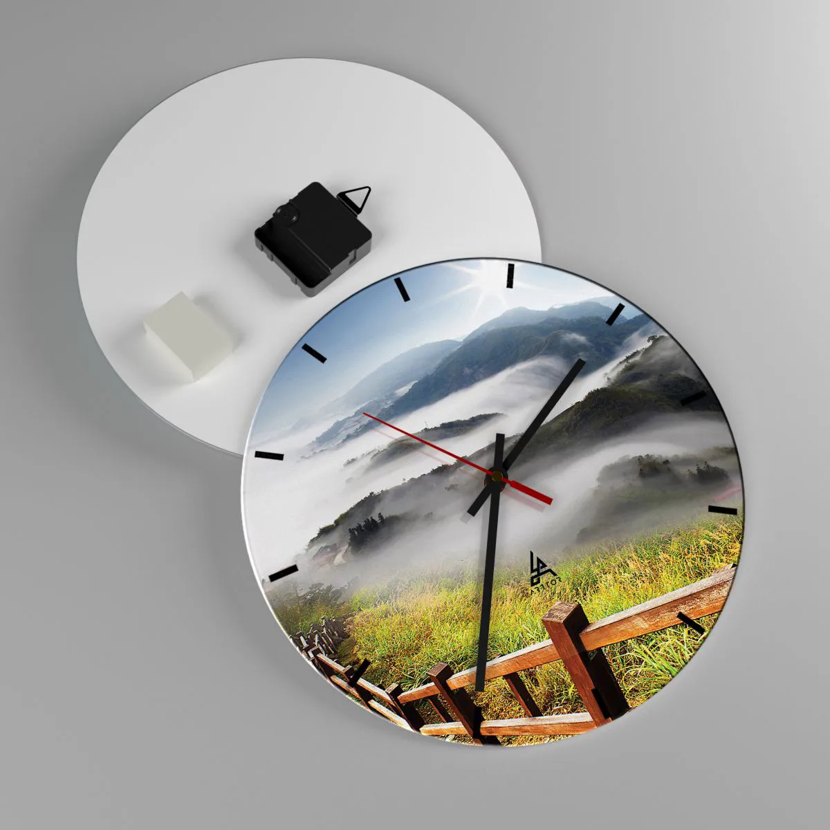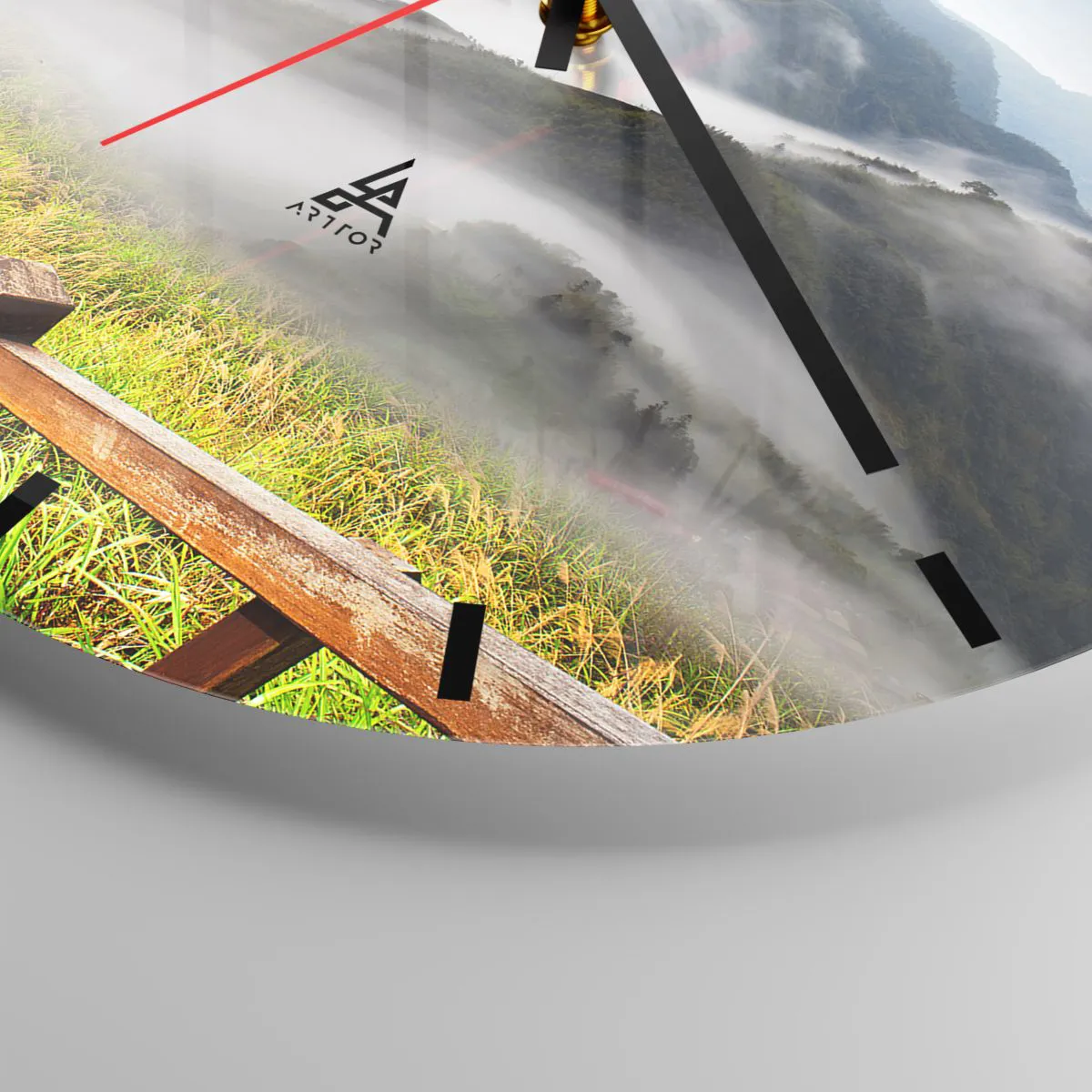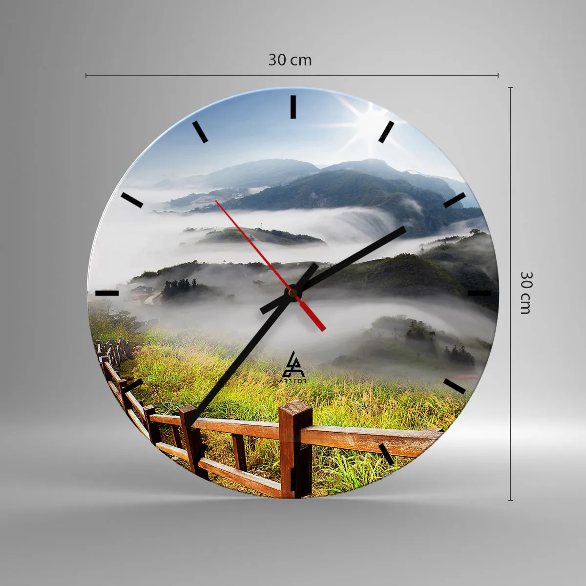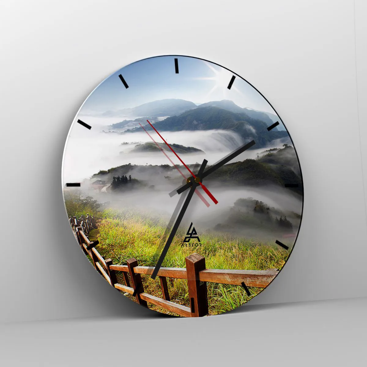 Wanduhr - Glasuhr - Blick auf ein nebliges Tal mit einem Holzzaun - 30x30cm - Gewebt aus Lichtschein und Nebel - Moderne Wanddekoration für Wohnzimmer, Küche und Schlafzimmer ARTTOR