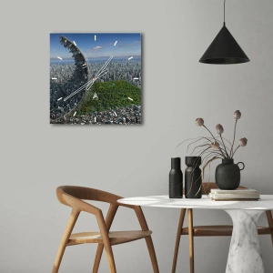 - Diese Wanduhr zeigt eine futuristische Stadt mit zerbrochener Struktur und Grün im Hintergrund. Ein faszinierendes Motiv für Liebhaber moderner Architektur und Zukunftsvisionen.