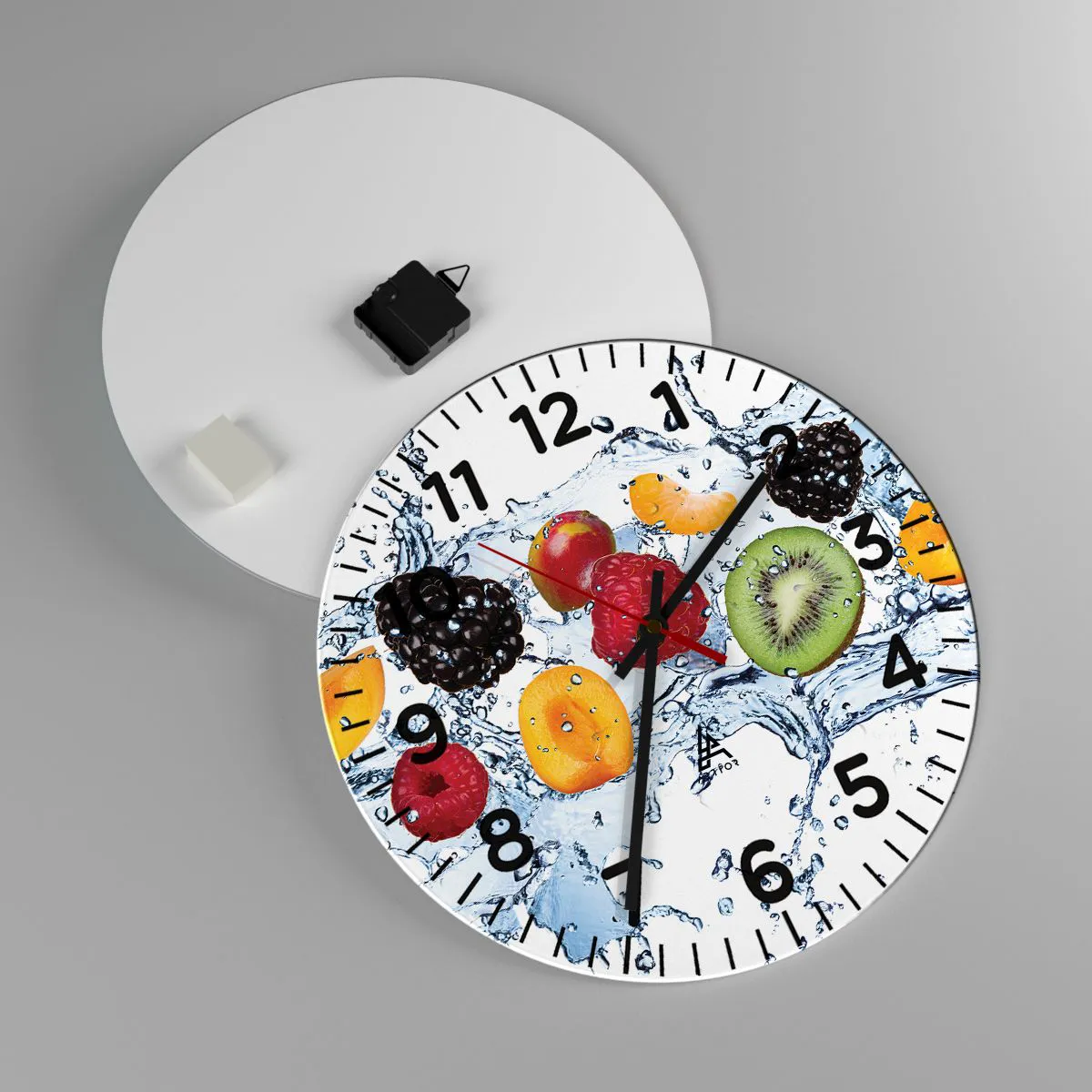 Die Uhr besteht aus 4 mm dickem Sicherheitsglas Glas. Die Herstellungstechnologie der Uhr entspricht der Sicherheitsklasse 2B2 gemäß der Norm PN-EN 12600: 2004, die Stoßfestigkeit garantiert. Die Uhr auf dem Glas ist bereit zu hängen - es hat einen Metallanhänger, einen Anhänger auf der Rückseite der Uhr und einen Schaumstoffabstand, der einen gleichmäßigen Abstand zwischen der Uhr und der Wand reguliert. Die Uhr hat einen geräuschlosen Schwimmmechanismus, der von einer 1,5-V-Batterie betrieben wird - AA-Batterie inbegriffen).