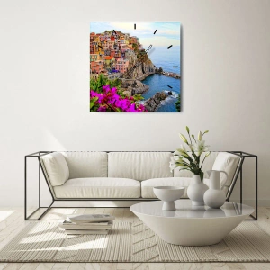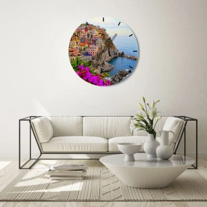 Das Motiv der farbenfrohen Gebäude vor dem Hintergrund des Meeres und üppiger Blumen verleiht dem Interieur einen Hauch von Exotik und mediterranem Stil. Diese Landschaft strahlt Ruhe und Harmonie aus und schafft einen Ort der Entspannung. Eine Uhr mit diesem Design ist auch eine perfekte Reiseinspiration für alle, die von einer Wanderung entlang der Küste träumen.