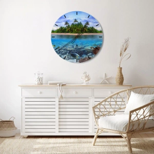 Wanduhr - Glasuhr - Eine tropische Insel, umgeben von einem türkisfarbenen Ozean mit einem Korallenriff und Fischen. - 30x30cm - Heavenly Island lädt dich ein - Moderne Wanddekoration für Wohnzimmer und Schlafzimmer ARTTOR