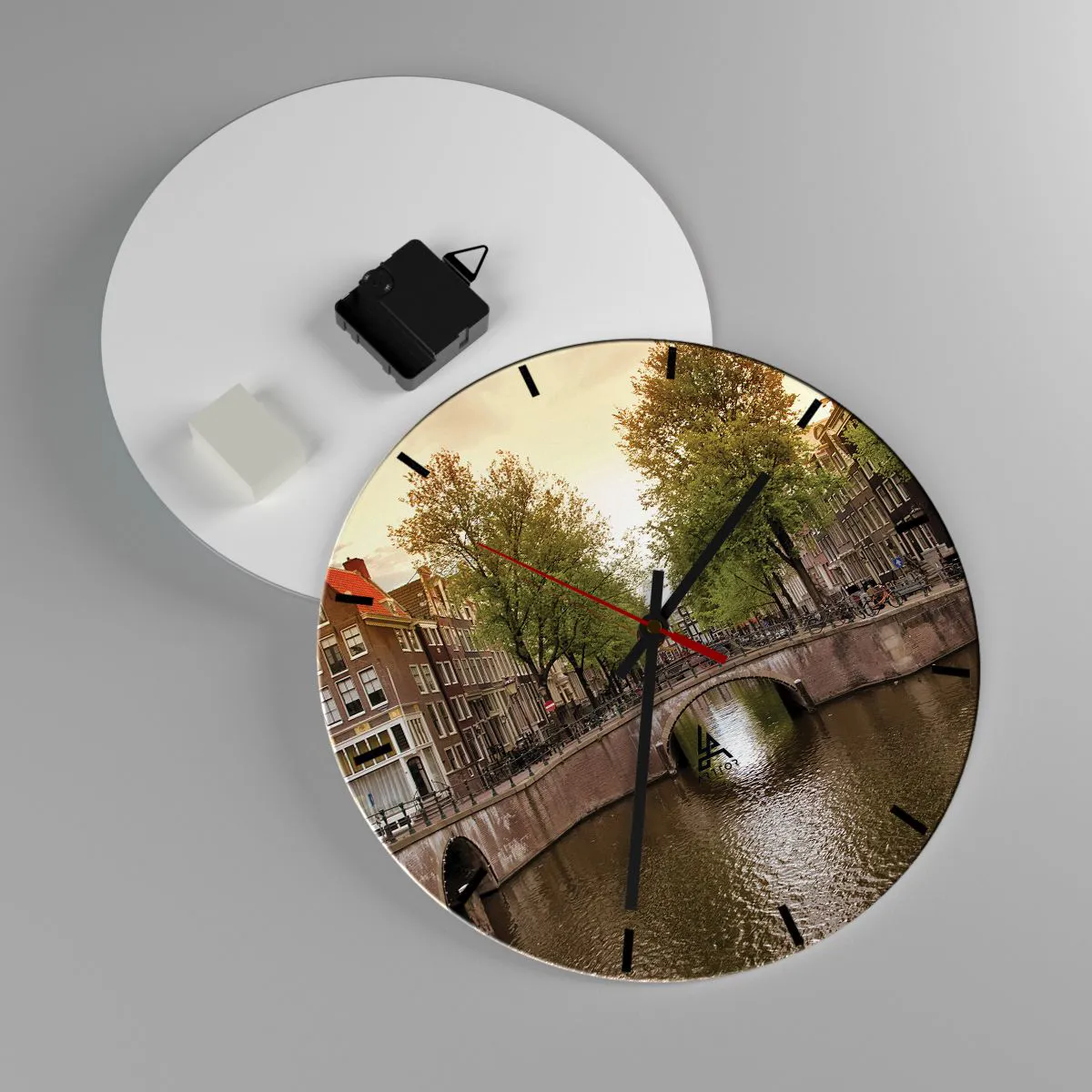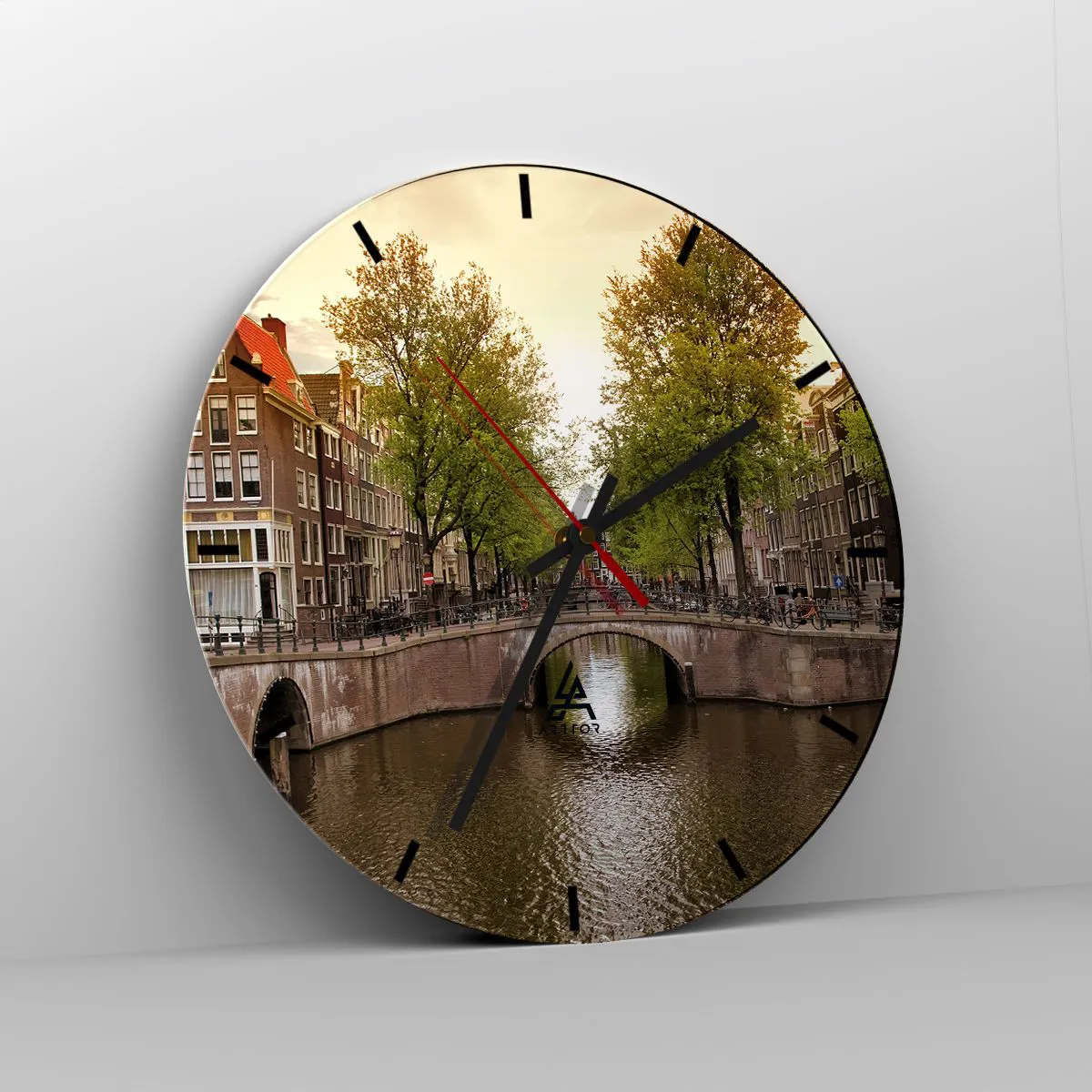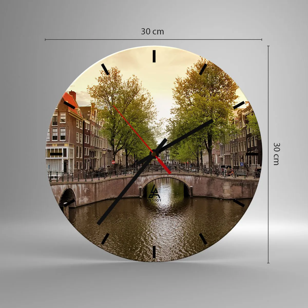 Wanduhr - Glasuhr - Kanal mit Brücke und Mietshäusern in Amsterdam - 30x30cm - Mit dem Boot oder mit dem Fahrrad? - Moderne Wanddekoration für Wohnzimmer, Küche und Schlafzimmer ARTTOR