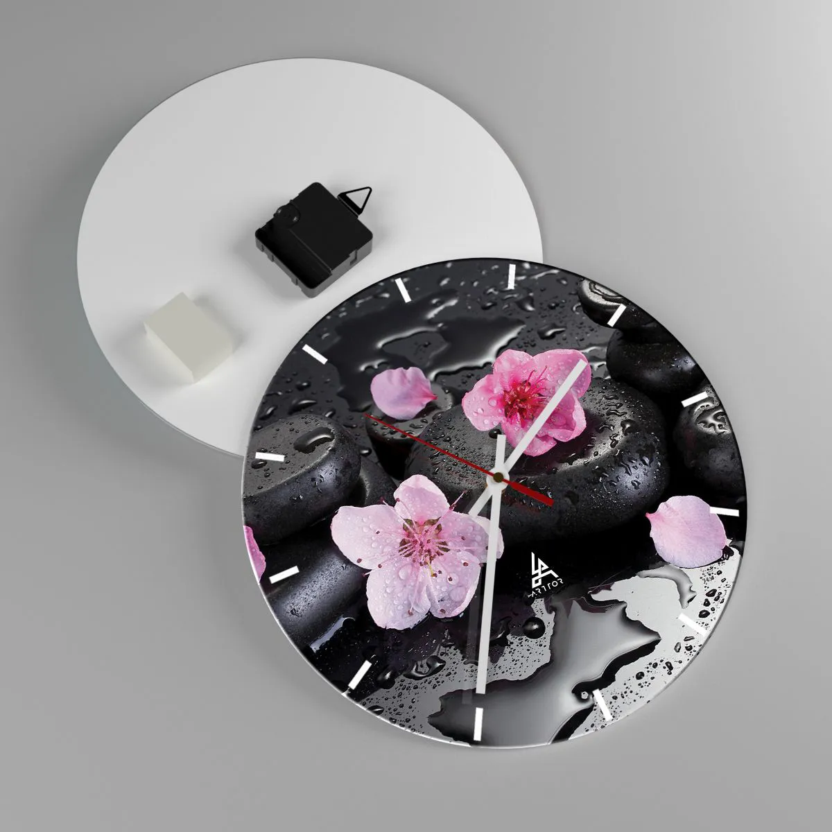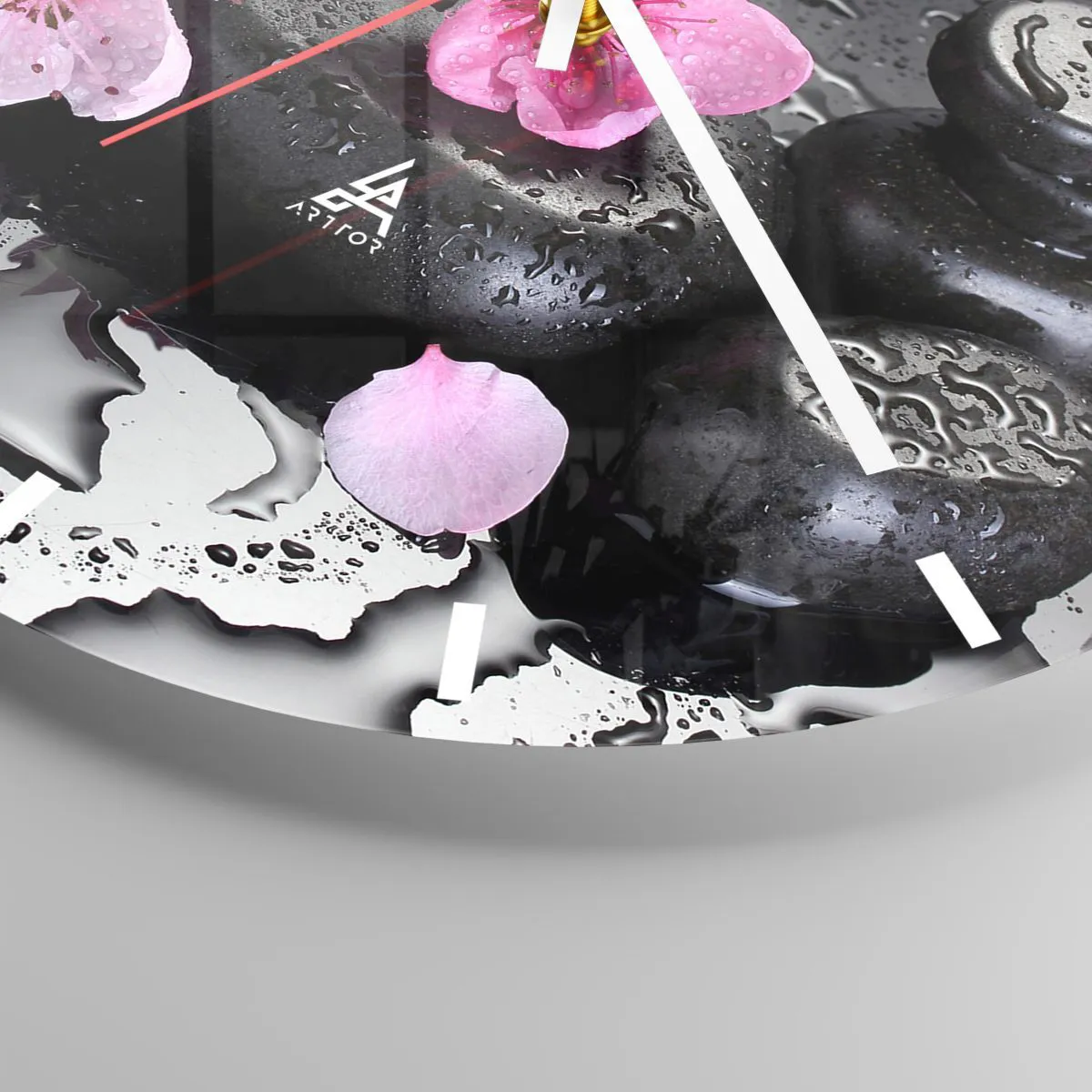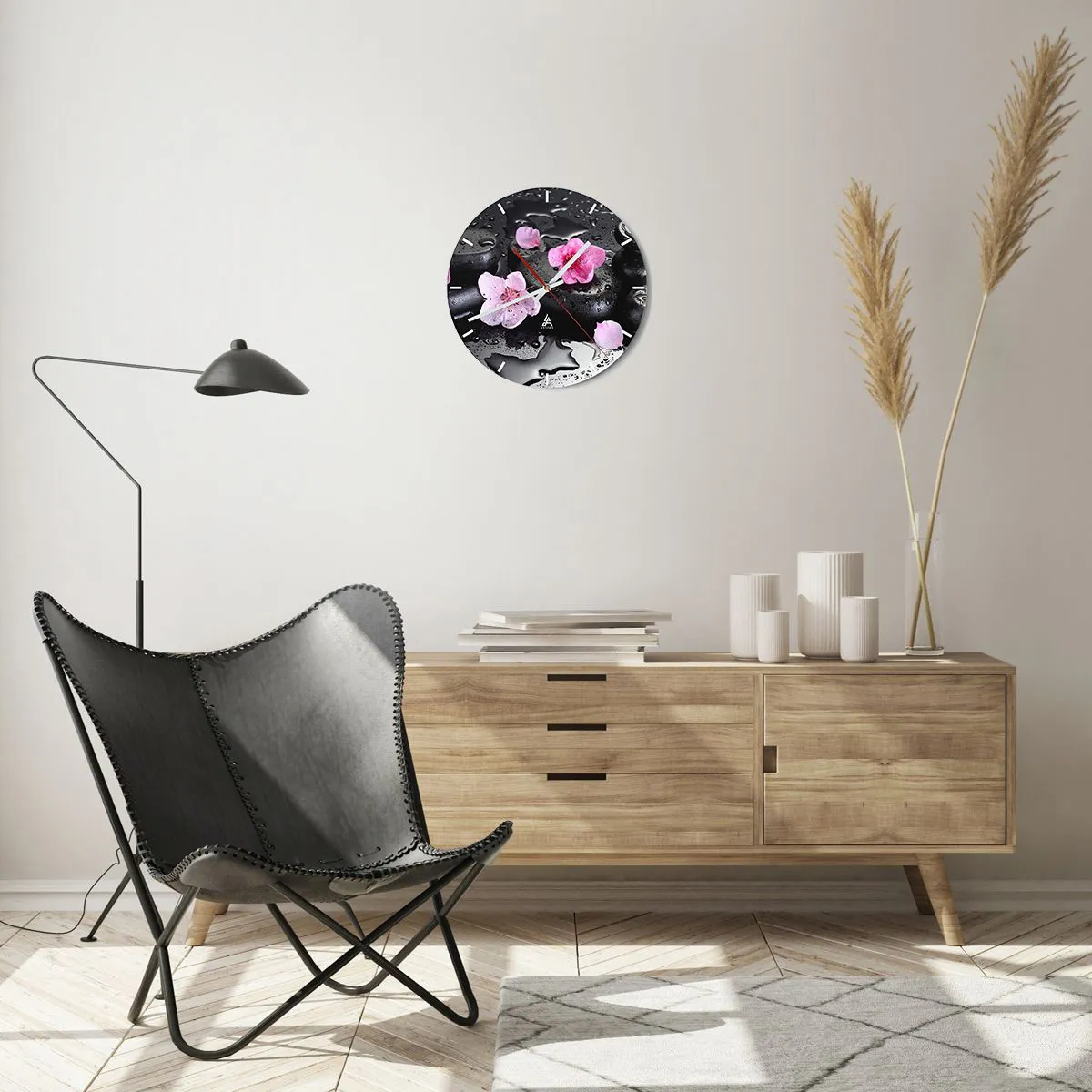 • Diese Uhr zeigt zarte rosa Kirschblüten auf schwarzen Steinen, die mit Wassertropfen bedeckt sind. Sie ist die perfekte Wahl für ein Spa-inspiriertes Interieur.