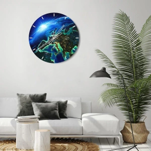 - Eine Wanduhr mit einem Motiv der Erde aus dem Weltraum mit beleuchteten Städten, perfekt für Liebhaber der Wissenschaft und des modernen Designs.