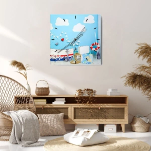 „Maritimes Motiv mit blauem Hintergrund“ ist eine einzigartige 30 x 30 cm große Wanduhr, die Urlaubsstimmung in jeden Raum bringt. Das Zifferblatt zeigt ein nautisches Motiv mit Details wie einem Boot, einer Karte, einem Rettungsring und Seilen, alles vor dem Hintergrund eines strahlenden Himmels mit weißen Wolken.