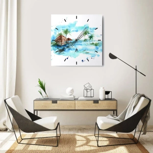 Wanduhr - Glasuhr - Aquarellmalerei einer tropischen Landschaft mit Häusern und Palmen - 30x30cm - Irgendwo im Pazifik - Moderne Wanddekoration für Wohnzimmer und Schlafzimmer ARTTOR