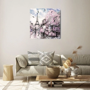 Wanduhr - Glasuhr - Romantischer Blick auf Paris mit dem Eiffelturm und blühenden Bäumen - 30x30cm - Wie man sich verlieben kann, ist nur in ... - Moderne Wanddekoration für Wohnzimmer, Küche und Schlafzimmer ARTTOR