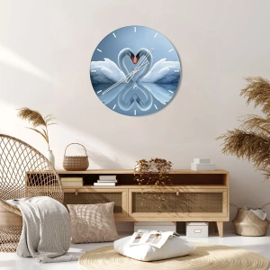 - Eine Wanduhr mit einem romantischen Motiv eines Schwanenpaares, das ein Herz bildet. Perfekt für Innenräume mit einem harmonischen und eleganten Stil.