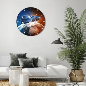 - Eine Wanduhr mit dem Motiv eines Raumschiffs über der Erde. Perfekt für Weltraumfans und futuristische Innenräume.