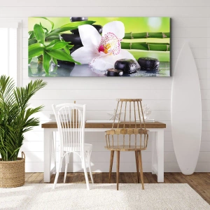 Kühle Frische ist ein Leinwandbild, das eine harmonische Spa-Komposition mit Orchideen, Bambus und Steinen, umgeben von zarten Grün- und Weißtönen, zeigt. Diese optisch beruhigende Szene bringt eine Atmosphäre von Frieden und Ruhe in jedes Interieur.