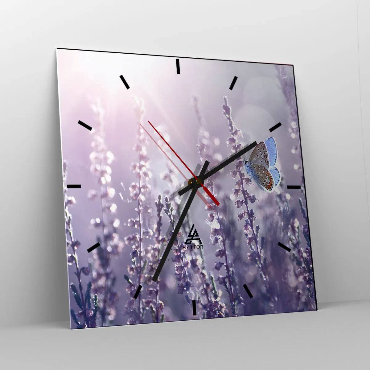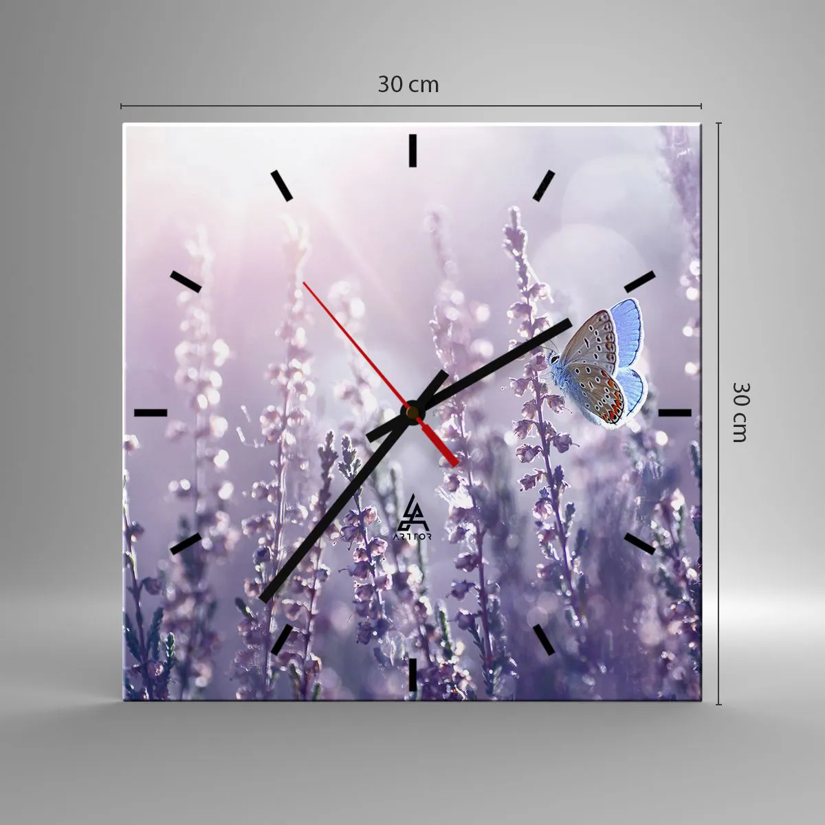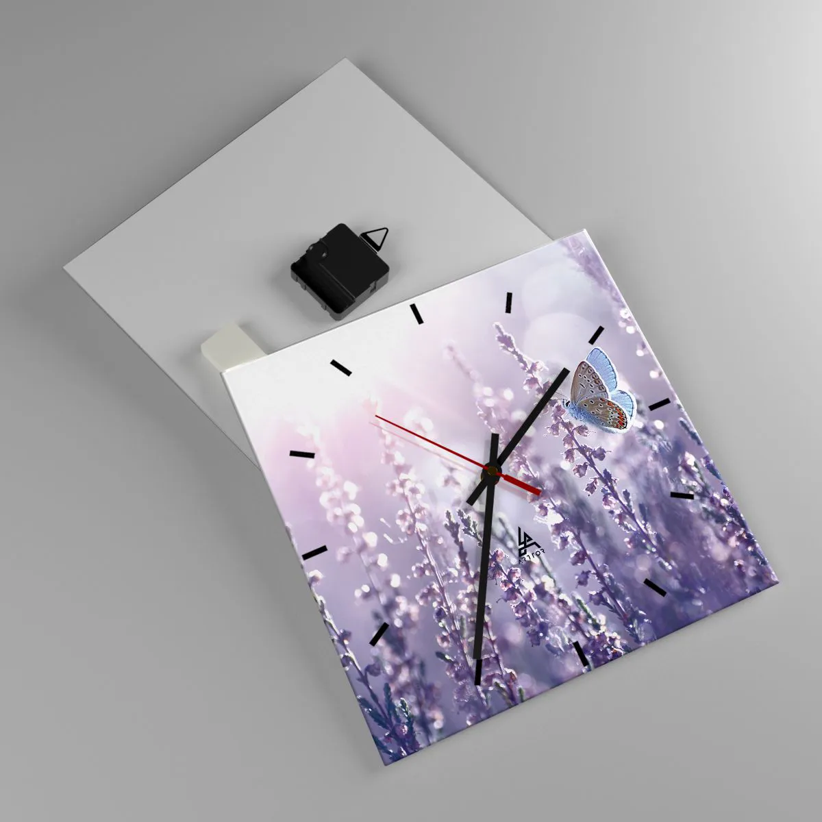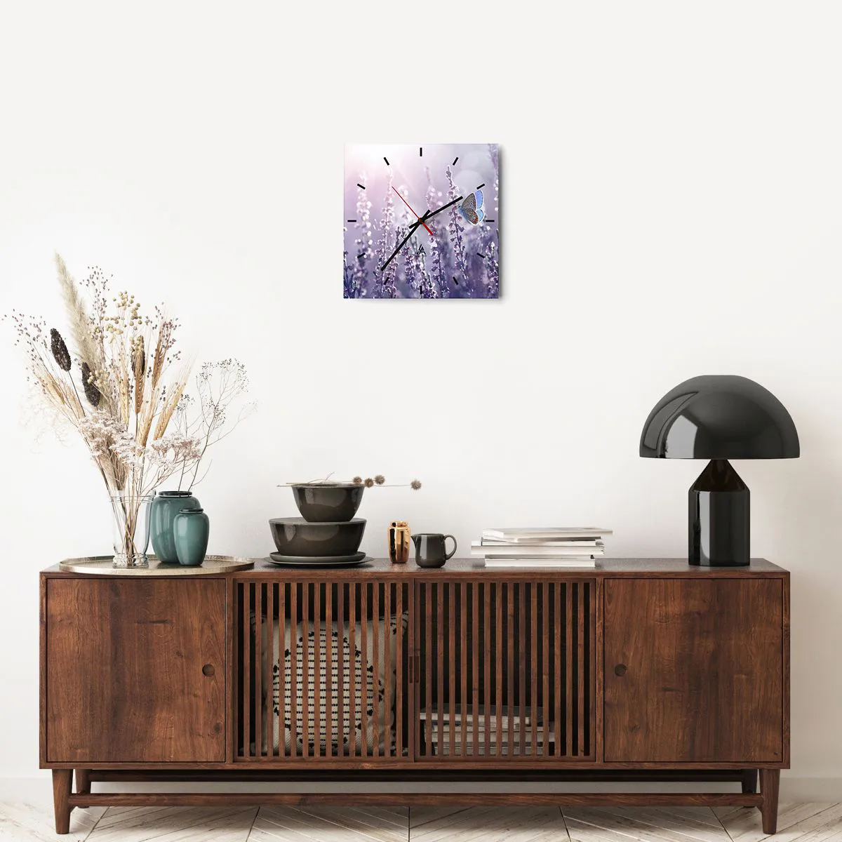 Wanduhr - Glasuhr - Ein Schmetterling auf blühendem Lavendel im Morgenlicht - 30x30cm - Schmetterlingskuss - Moderne Wanddekoration für Wohnzimmer und Schlafzimmer ARTTOR