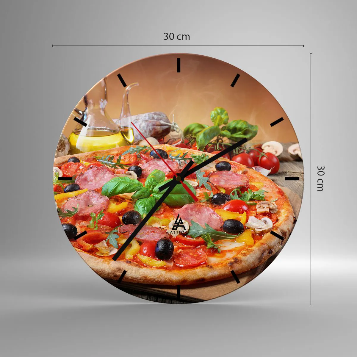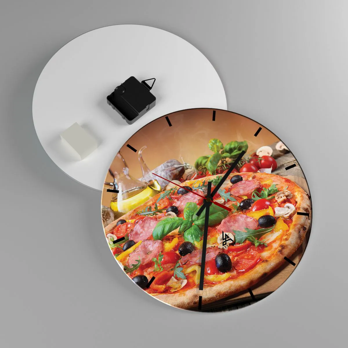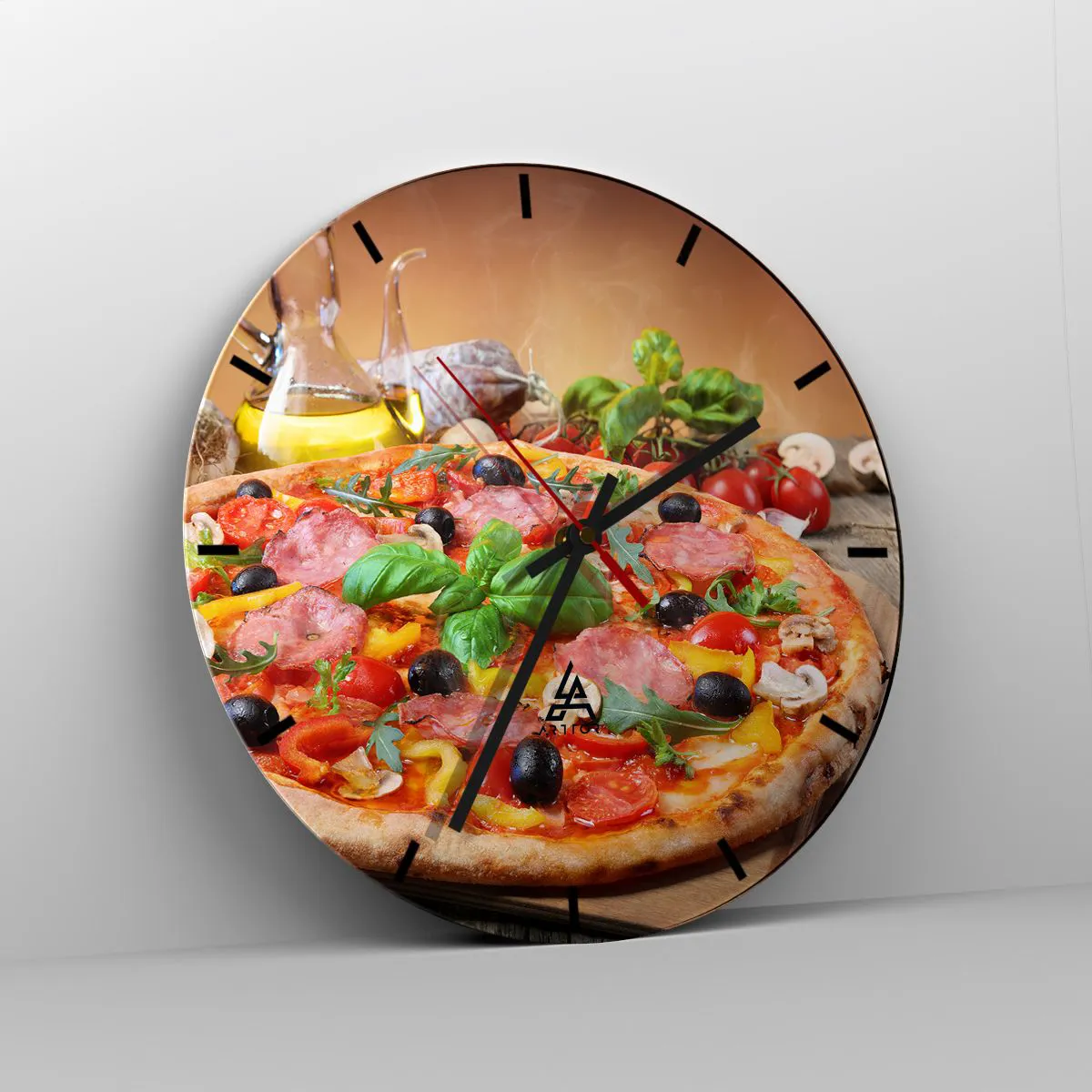 - Diese runde Wanduhr im Format 30 x 30 cm zeigt eine köstliche Pizza mit Belag und Küchenzubehör im Hintergrund. Perfekt für Küchen und Innenräume im italienischen Stil.