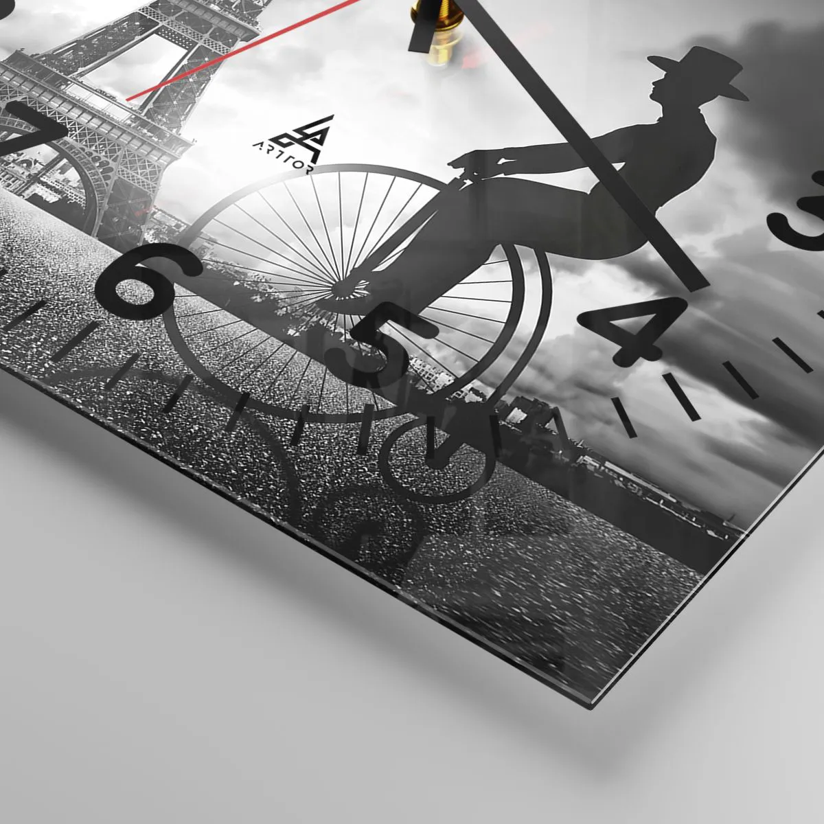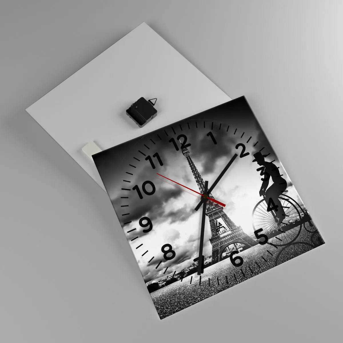 Die Uhr besteht aus 4 mm dickem Sicherheitsglas Glas. Die Herstellungstechnologie der Uhr entspricht der Sicherheitsklasse 2B2 gemäß der Norm PN-EN 12600: 2004, die Stoßfestigkeit garantiert. Die Uhr auf dem Glas ist bereit zu hängen - es hat einen Metallanhänger, einen Anhänger auf der Rückseite der Uhr und einen Schaumstoffabstand, der einen gleichmäßigen Abstand zwischen der Uhr und der Wand reguliert. Die Uhr hat einen geräuschlosen Schwimmmechanismus, der von einer 1,5-V-Batterie betrieben wird - AA-Batterie inbegriffen).