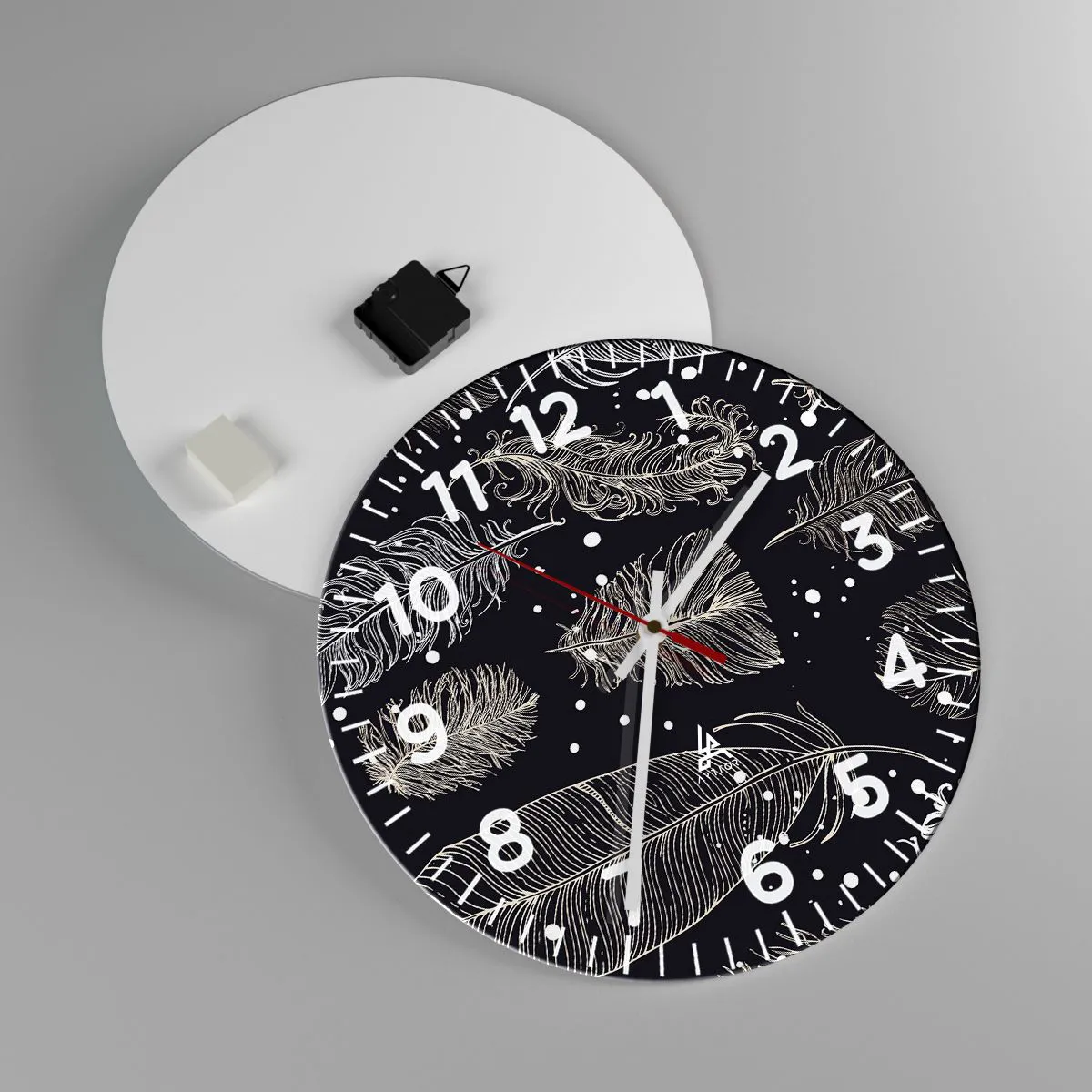 Die Uhr besteht aus 4 mm dickem Sicherheitsglas Glas. Die Herstellungstechnologie der Uhr entspricht der Sicherheitsklasse 2B2 gemäß der Norm PN-EN 12600: 2004, die Stoßfestigkeit garantiert. Die Uhr auf dem Glas ist bereit zu hängen - es hat einen Metallanhänger, einen Anhänger auf der Rückseite der Uhr und einen Schaumstoffabstand, der einen gleichmäßigen Abstand zwischen der Uhr und der Wand reguliert. Die Uhr hat einen geräuschlosen Schwimmmechanismus, der von einer 1,5-V-Batterie betrieben wird - AA-Batterie inbegriffen).
