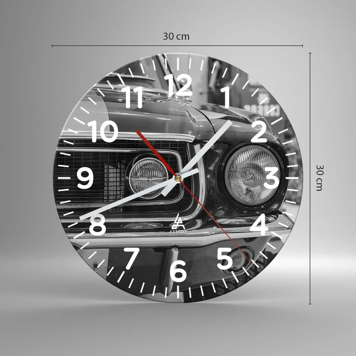 Die Uhr besteht aus 4 mm dickem Sicherheitsglas Glas. Die Herstellungstechnologie der Uhr entspricht der Sicherheitsklasse 2B2 gemäß der Norm PN-EN 12600: 2004, die Stoßfestigkeit garantiert. Die Uhr auf dem Glas ist bereit zu hängen - es hat einen Metallanhänger, einen Anhänger auf der Rückseite der Uhr und einen Schaumstoffabstand, der einen gleichmäßigen Abstand zwischen der Uhr und der Wand reguliert. Die Uhr hat einen geräuschlosen Schwimmmechanismus, der von einer 1,5-V-Batterie betrieben wird - AA-Batterie inbegriffen).