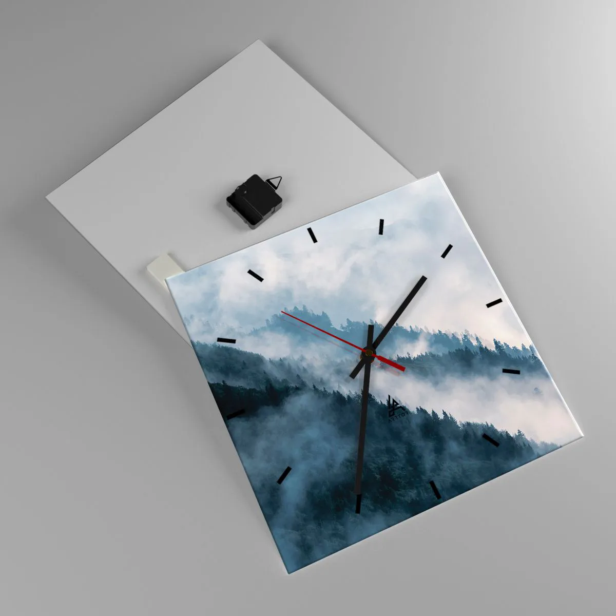 Die Uhr besteht aus 4 mm dickem Sicherheitsglas Glas. Die Herstellungstechnologie der Uhr entspricht der Sicherheitsklasse 2B2 gemäß der Norm PN-EN 12600: 2004, die Stoßfestigkeit garantiert. Die Uhr auf dem Glas ist bereit zu hängen - es hat einen Metallanhänger, einen Anhänger auf der Rückseite der Uhr und einen Schaumstoffabstand, der einen gleichmäßigen Abstand zwischen der Uhr und der Wand reguliert. Die Uhr hat einen geräuschlosen Schwimmmechanismus, der von einer 1,5-V-Batterie betrieben wird - AA-Batterie inbegriffen).