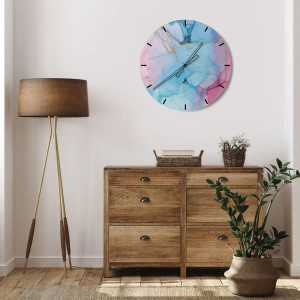 Die Wanduhr „Begegnung und Durchdringung“ ist eine einzigartige künstlerische Komposition, die Pastelltöne in Blau und Rosa mit dezenten Goldakzenten kombiniert. Inspiriert von Aquarellen und Marmorstrukturen gewinnt die Komposition an Tiefe und Leichtigkeit zugleich. Farbspritzer verflechten sich und schaffen ein harmonisches Bild voller Zartheit und Eleganz.