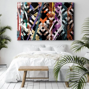 Die Leinwand wird über den Rahmen gespannt. Die Seiten und Kanten werden gedruckt, um das Bild fortzusetzen. Das Bild ist fertig zum Aufhängen an der Wand. Jedes Produkt hat einen am Rahmen befestigten Anhänger und ein Montageset (Schraube + Stift).