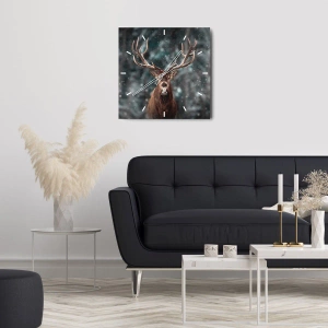 - Diese Wanduhr zeigt einen majestätischen Hirsch, der in einem Winterwald steht. Die verschneite Landschaft und das stolz erhobene Geweih vermitteln ein Bild von Stärke, Frieden und natürlicher Harmonie.