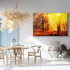 - Ein Gemälde, das eine Herbstlichtung mit einem Waldweg im goldenen Sonnenlicht darstellt. Eine stimmungsvolle und malerische Komposition, die die Harmonie und Schönheit der Natur ins Innere bringt.