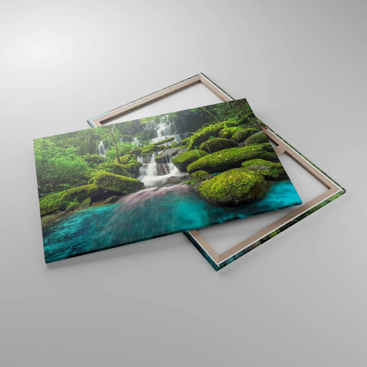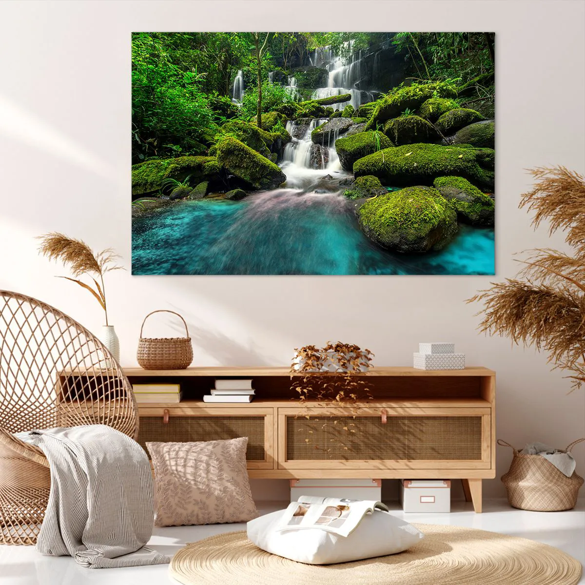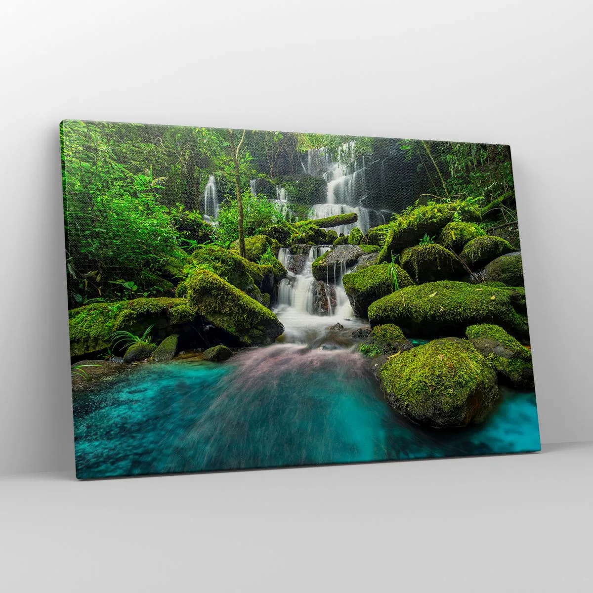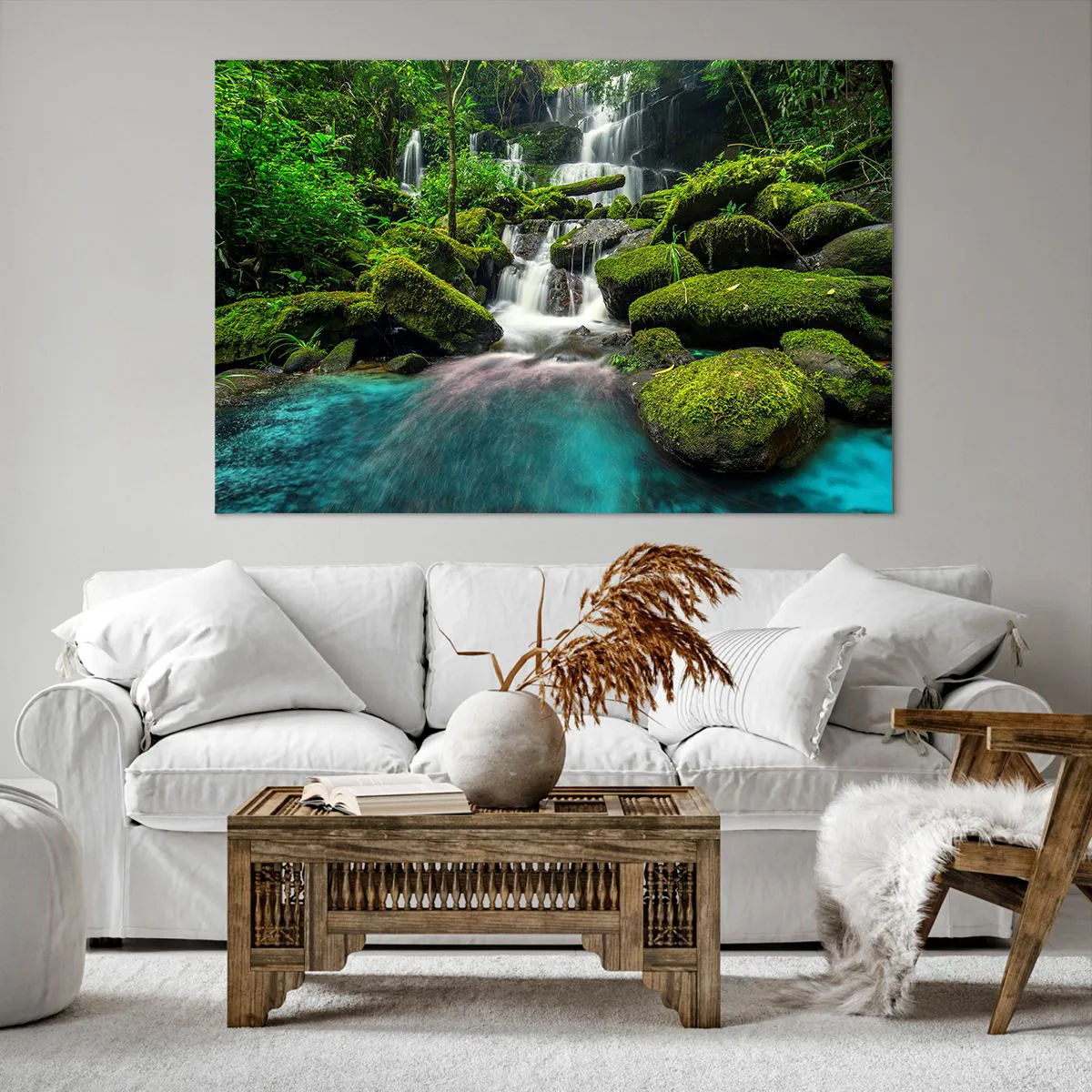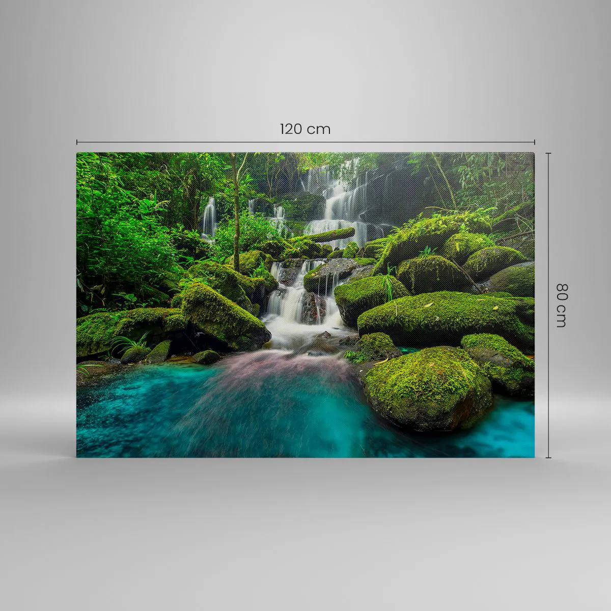 Bild auf Leinwand - Leinwandbild - Ein tropischer Wasserfall, umgeben von Grün und türkisfarbenem Wasser - 120x80cm - Türkis, Saphire und flüssiges Silber - Moderne Wanddekoration für Wohnzimmer und Schlafzimmer ARTTOR