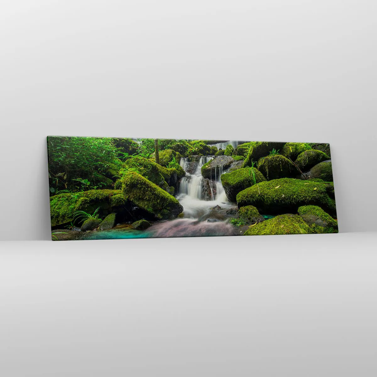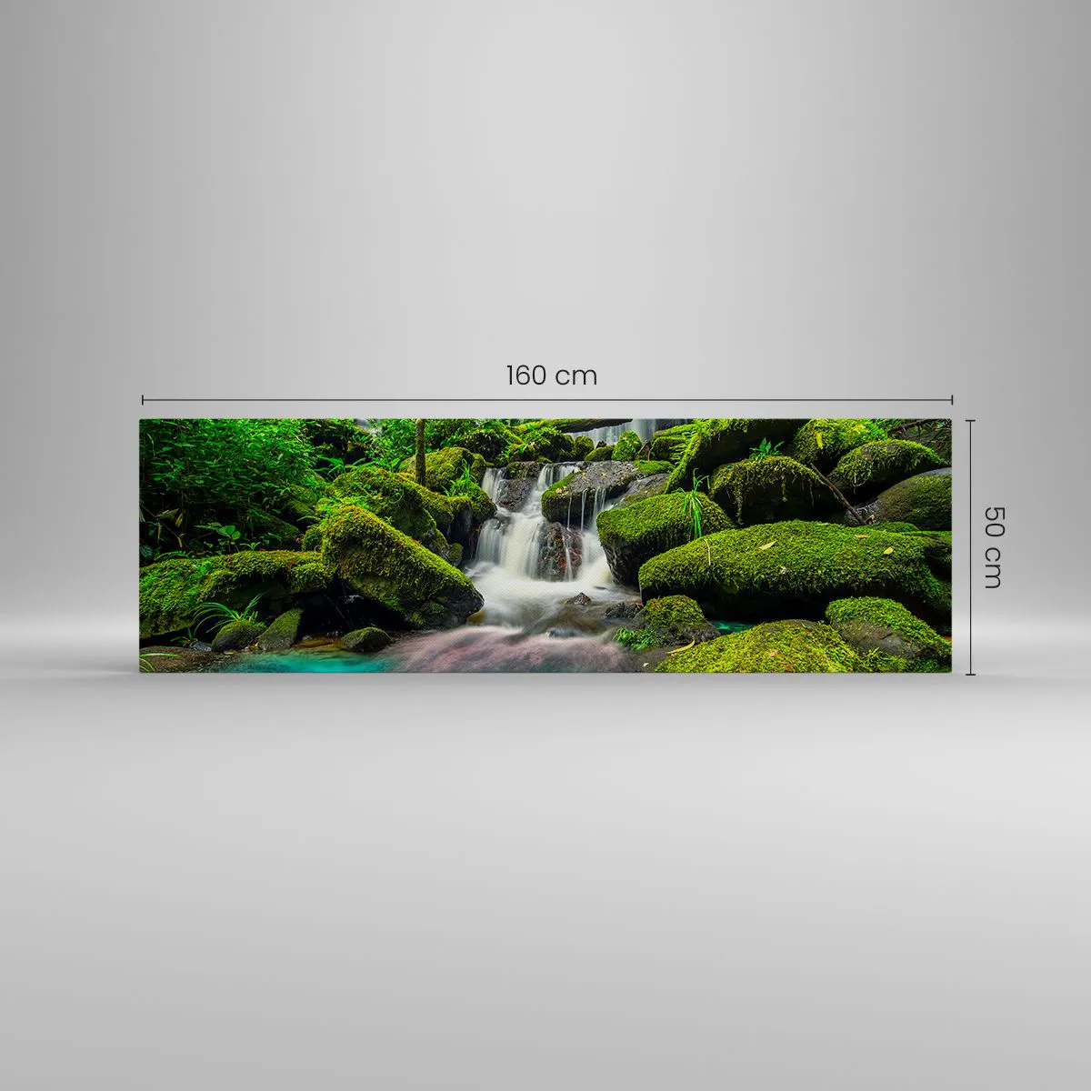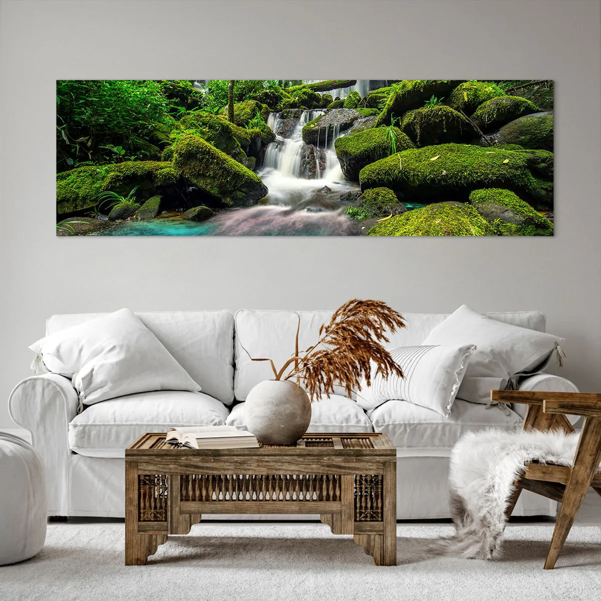 Bild auf Leinwand - Leinwandbild - Ein tropischer Wasserfall, umgeben von Grün und türkisfarbenem Wasser - 160x50cm - Türkis, Saphire und flüssiges Silber - Moderne Wanddekoration für Wohnzimmer und Schlafzimmer ARTTOR
