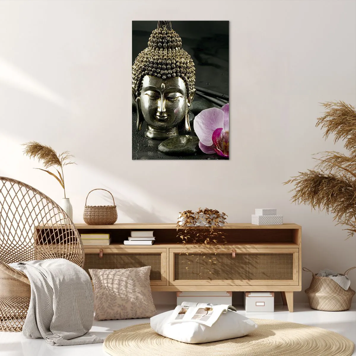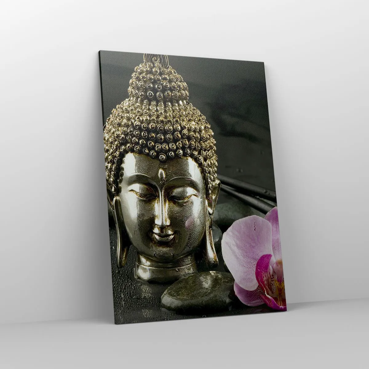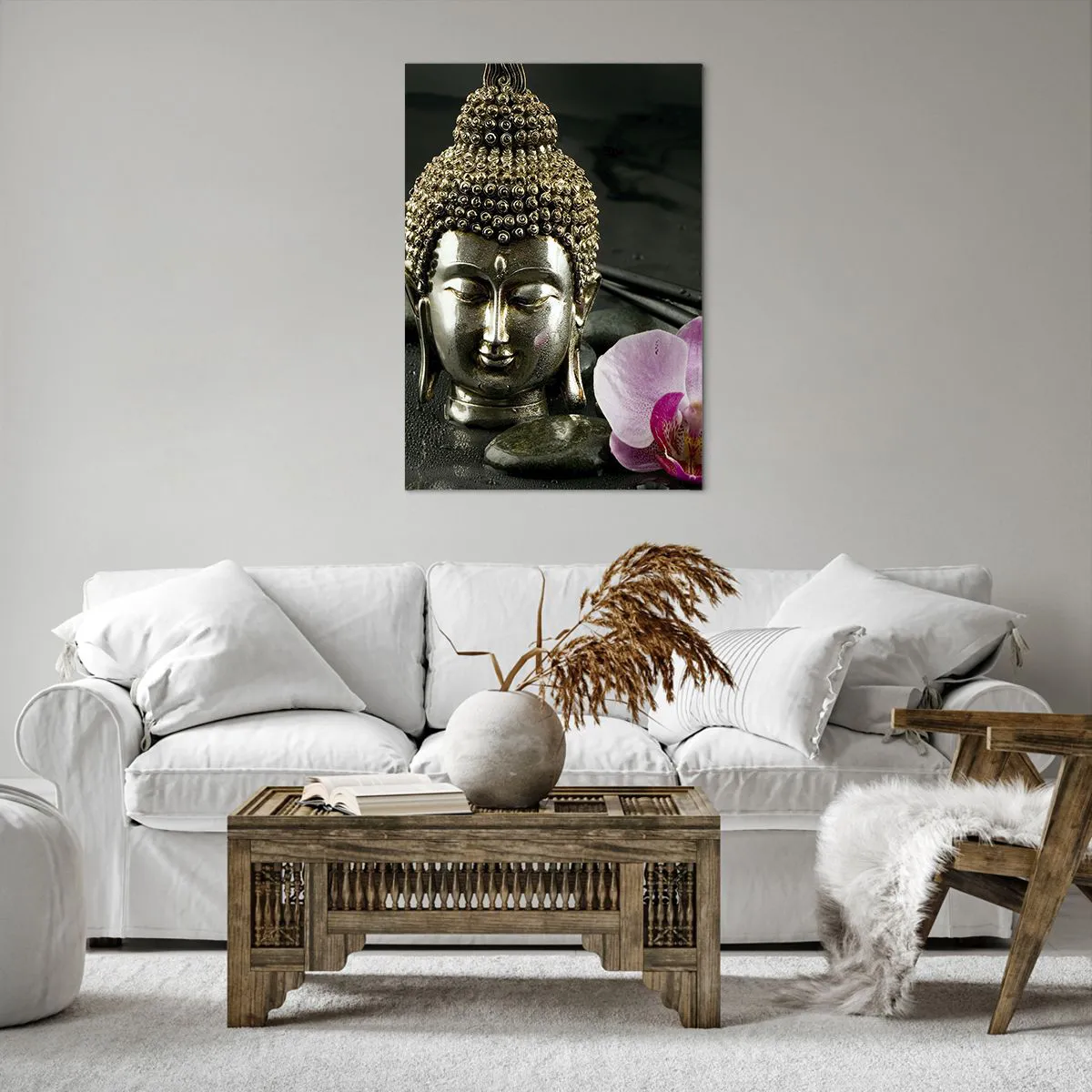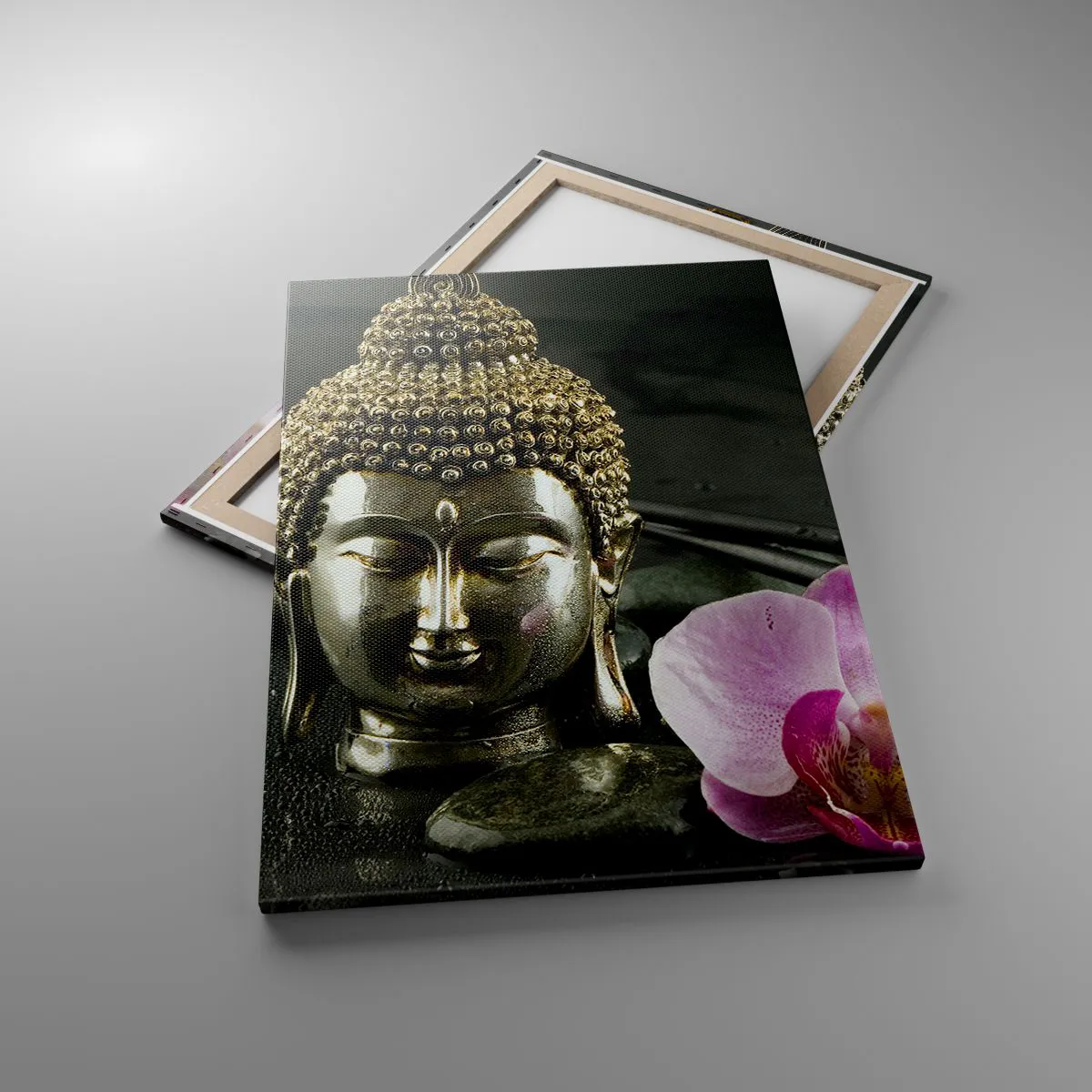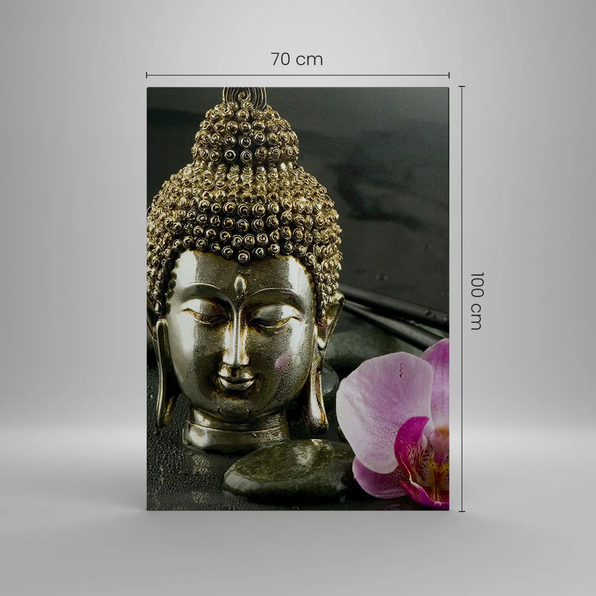 Bild auf Leinwand - Leinwandbild - Eine Buddha-Statuette mit Orchidee und Essstäbchen vor einem Hintergrund aus Steinen - 70x100cm - Harmonie von Weisheit und Schönheit - Moderne Wanddekoration für Wohnzimmer und Schlafzimmer ARTTOR