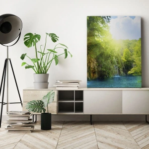 Bild auf Leinwand - Leinwandbild - Ein Wasserfall, der in einen türkisfarbenen See fließt, umgeben von Grün - 50x70cm - Es muss Eden sein - Moderne Wanddekoration für Wohnzimmer und Schlafzimmer ARTTOR